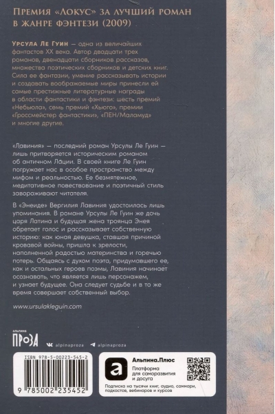 The hero of Virgil's Aeneid fights for the right to possess the daughter of King Latinus, with whom he is destined to found an empire. Only a few lines are dedicated to Lavinia herself in the poem. In Ursula Le Guin's novel, Lavinia finds a voice: she tells the story of her life - from a young girl who caused a bloody war, but stubbornly followed her chosen destiny, to maturity, filled with the joy of motherhood and the bitterness of loss.
