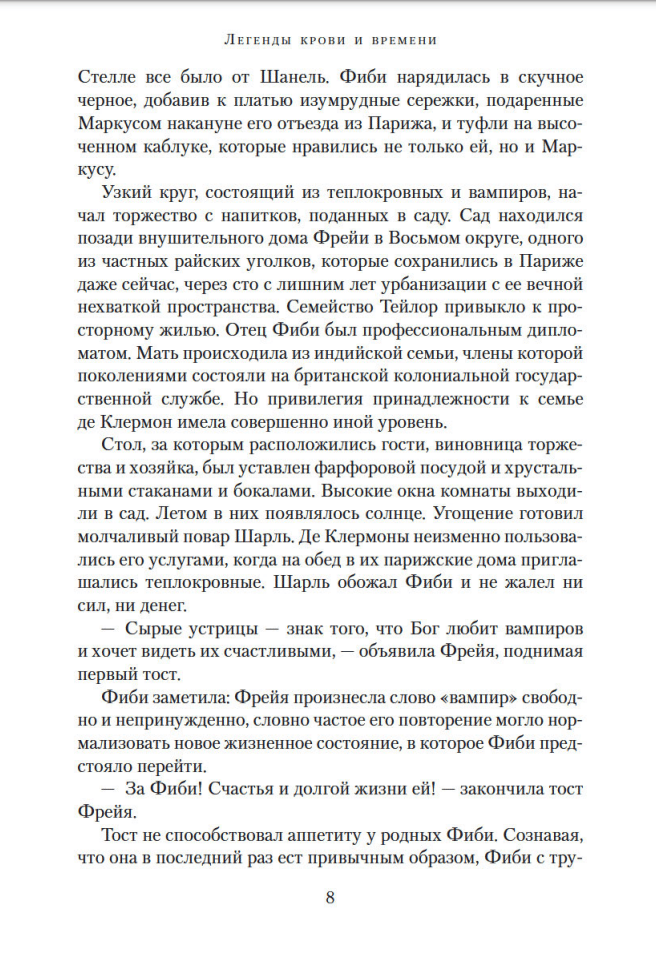 18th century. UNITED STATES. The War of Independence is underway. During one of the battles, Matthew de Clermont meets Marcus McNeil, a young army surgeon. A few years later, meeting Marcus again, who is dying of typhoid fever, Matthew offers him a chance to start a new life, free of disease and almost immortal. Marcus seizes this chance and becomes a vampire. But the ancient traditions and numerous duties on which the de Clermont family's way of life is based come into violent conflict with the ideals of freedom, equality and brotherhood in which Marcus deeply believes. XXI century. Paris. Phoebe Taylor, a young employee of the Sotheby's auction house, with whom Marcus has fallen in love, decides to become a vampire and is ready to begin her journey into immortality. Although the modern version of the process of turning a human into a vampire seems uncomplicated at first, Phoebe and Marcus soon discover: the difficulties and dangers that beset humans along the way haven't changed a bit since the eighteenth century. "Legends of Blood and Time" is a story of passionate love bridging the centuries, and a gripping exploration of the power of tradition and the possibility of change right up to the Revolution. It is a tale of a supernatural world order and a leisurely unfolding romance of the events described.