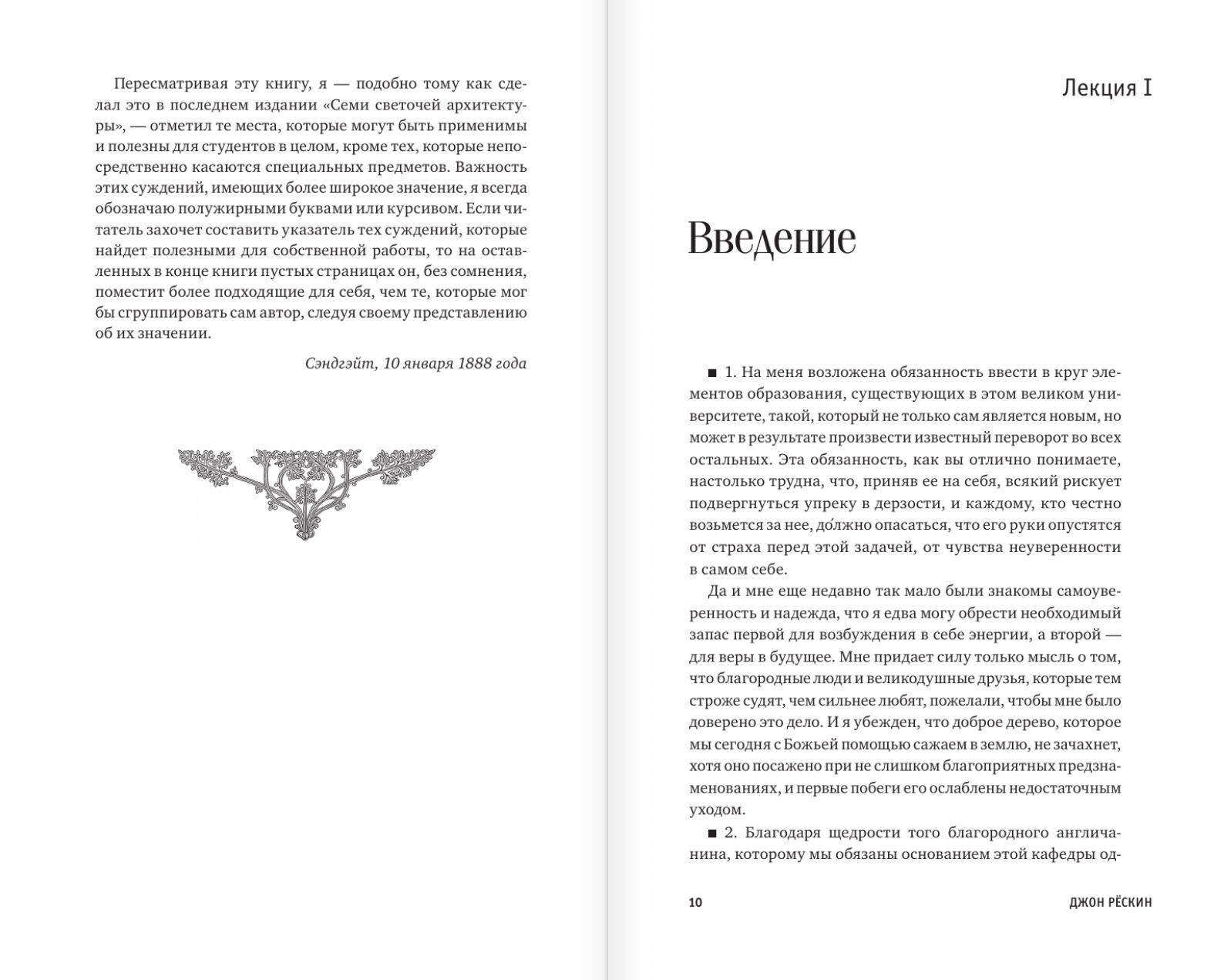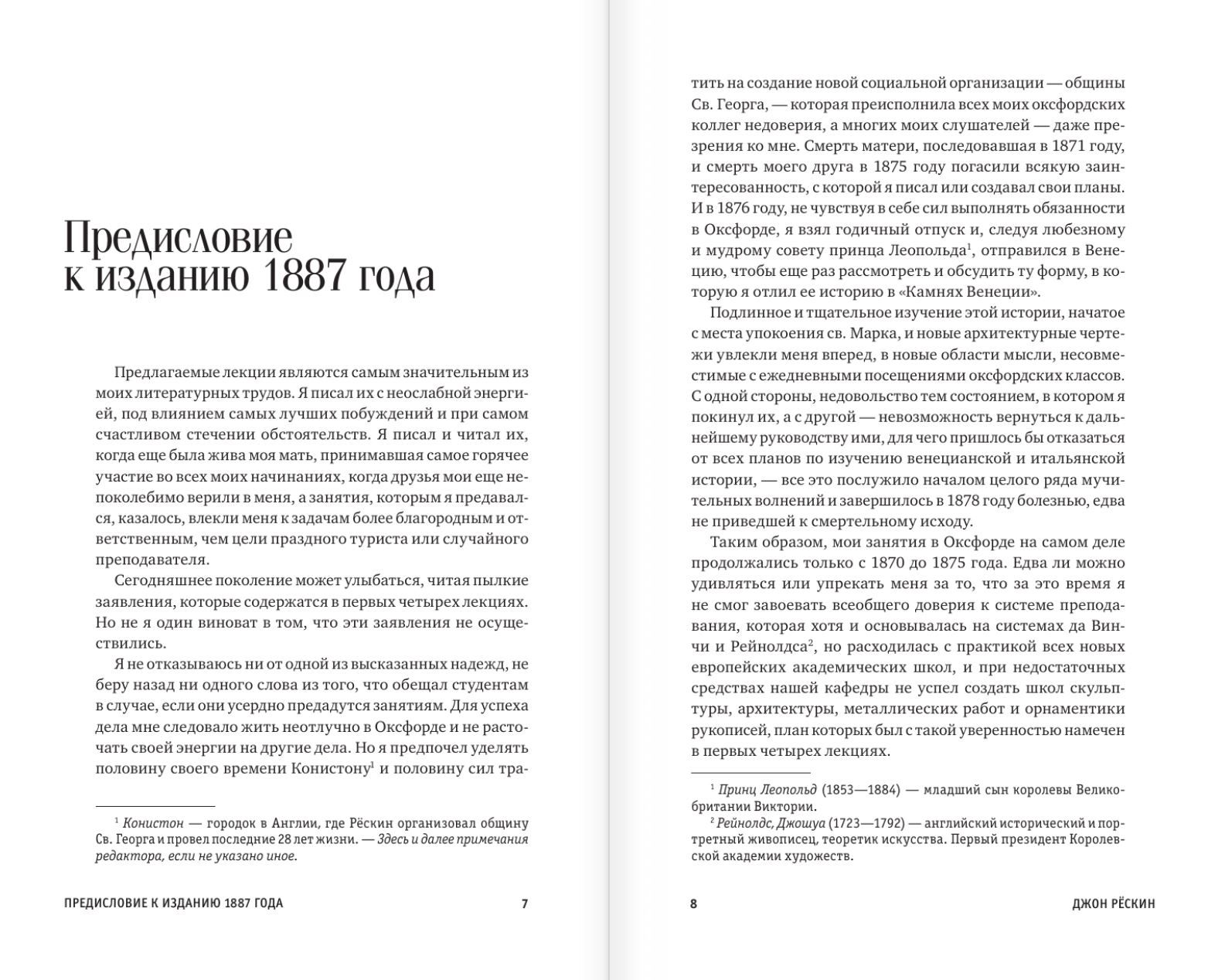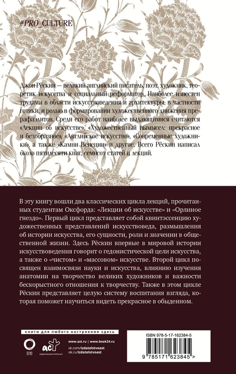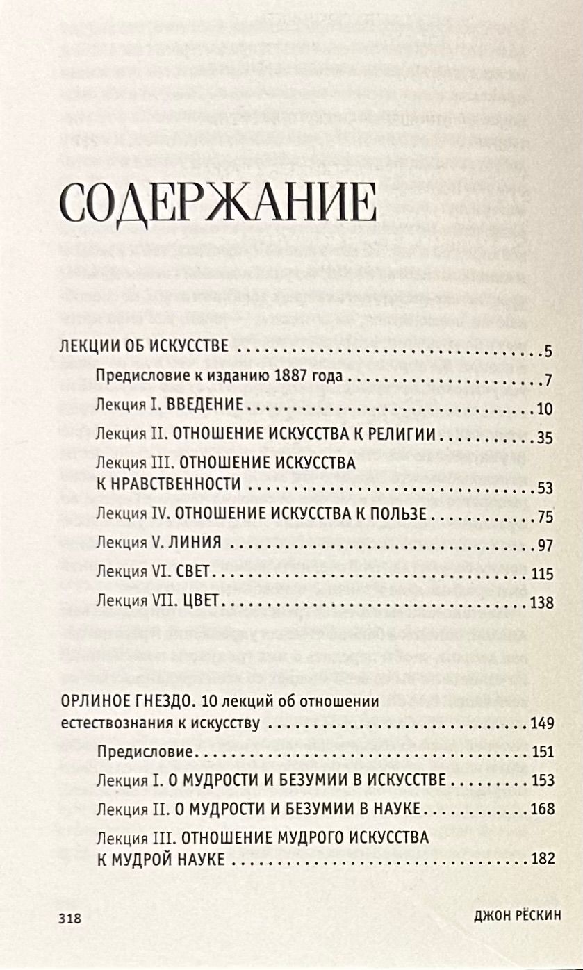 This book includes two classic cycles of lectures delivered to Oxford students, Lectures on Art and The Eagle's Nest. The first cycle is a quintessence of artistic ideas of the art historian, reflections on the history of art, its essence, role and significance in public life. Here Ruskin, for the first time in the world history of art history, speaks about the hedonistic purpose of art, as well as about "pure" and "mass" art. The second cycle deals with the relationship between science and art, the influence of the study of anatomy on the work of great artists, and the importance of an unselfish attitude to creativity. Also in this cycle Ruskin presents a whole system of education of the gaze, which will help to learn to see the beautiful in the ordinary.