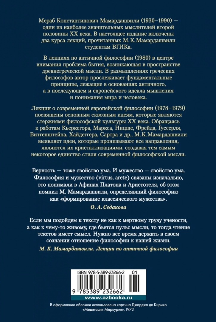 Merab Konstantinovich Mamardashvili (1930-1990) is one of the most significant thinkers of the second half of the twentieth century. This edition includes two courses of lectures given by M. K. Mamardashvili to the students of VGIK. The lectures on ancient philosophy (1980) center on the problem of being, which emerges in the space of ancient Greek thought. In the reflections of Greek philosophers, the author traces the fundamental principles underlying the ancient and later European ideal of thinking and understanding of the world and man. The Lectures on Modern European Philosophy (1978-1979) are devoted to the main cross-cutting ideas that are at the core of twentieth-century philosophical culture. Turning to the works of Kierkegaard, Marx, Nietzsche, Freud, Husserl, Wittgenstein, Heidegger, Sartre and others, M. K. Mamardashvili reveals the ideas that permeate all directions, are their crystallizations, thus creating a certain unity of the style of modern philosophical thought.