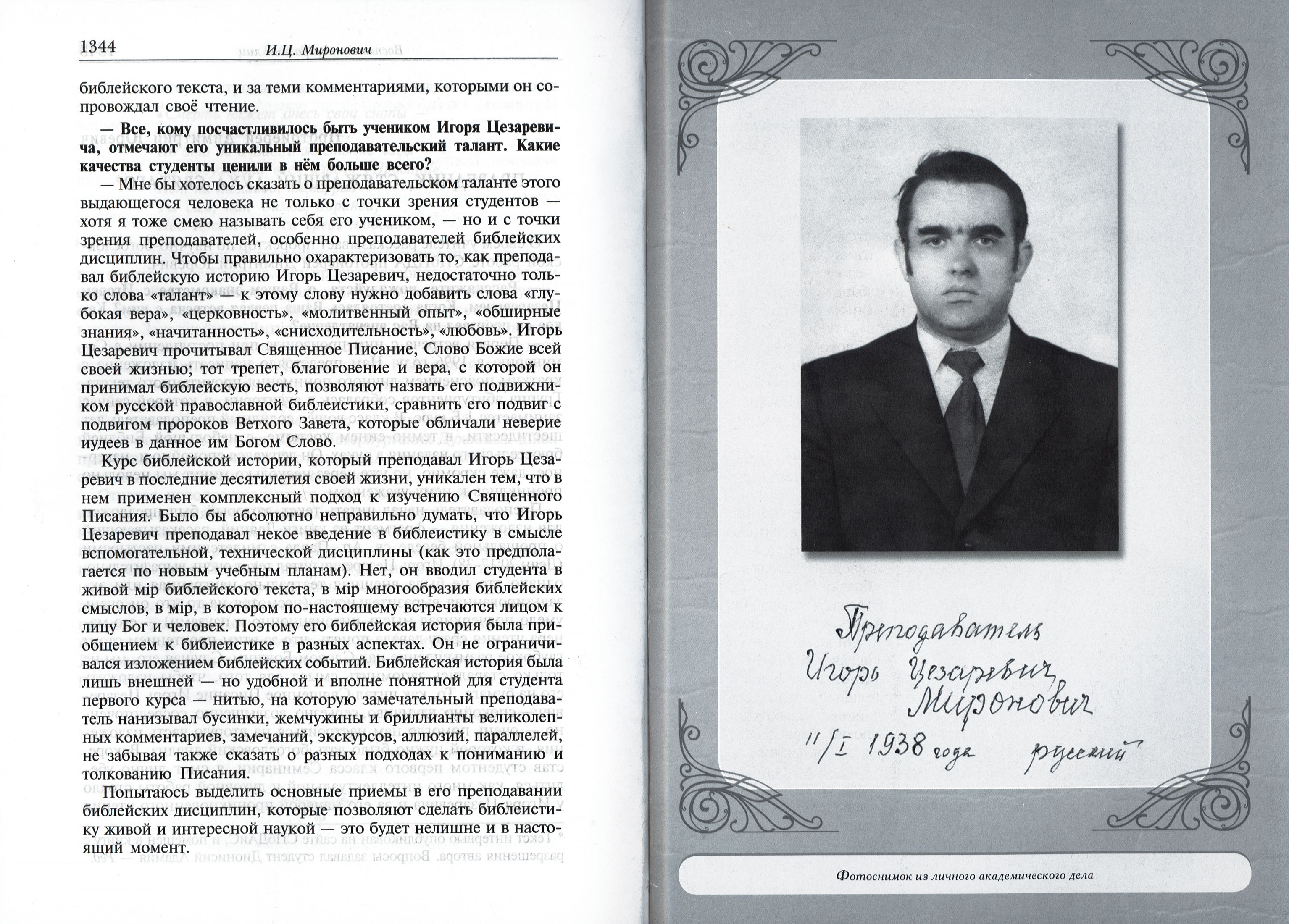 For everyone who was lucky enough to know Igor Tsesarevich, the meeting with such a large-scale person as he was, became significant and fateful. This meeting was especially important for those students of theological schools who later became priests. Through his lectures, students studied not only the external outline of biblical history, but entered the living world of the biblical text, comprehending the diversity of biblical meanings, a world in which man and God truly meet face to face.