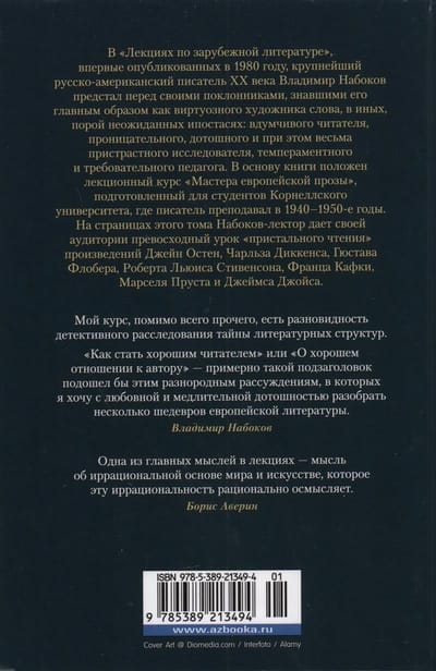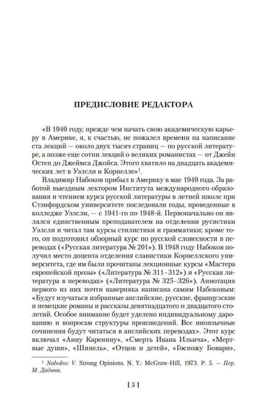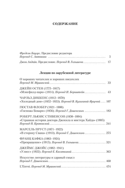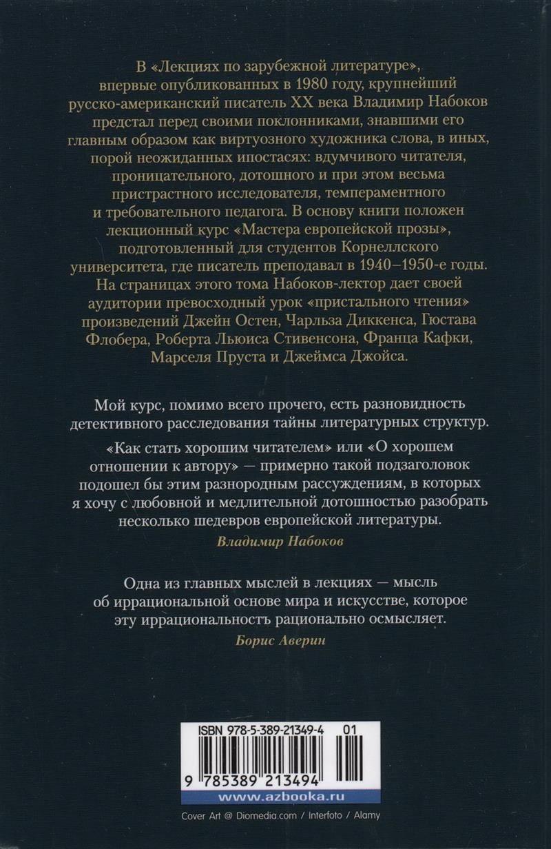 In "Lectures on Foreign Literature", first published in 1980, the greatest Russian-American writer of the twentieth century Vladimir Nabokov appeared before his admirers, who knew him mainly as a virtuoso artist of the word, in other, sometimes unexpected hypostasis: thoughtful reader, insightful, meticulous and yet very biased researcher, temperamental and demanding teacher. The book is based on the lecture course "Masters of European Prose", prepared for students at Cornell University, where the writer taught in 1940-1950-ies. In the pages of this volume, Nabokov the lecturer gives his audience a superb lesson in "close reading" of the works of Jane Austen, Charles Dickens, Gustave Flaubert, Robert Lewis Stevenson, Franz Kafka, Marcel Proust, and James Joyce.
