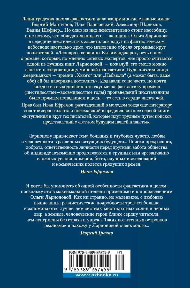 “The Leopard from the Top of Kilimanjaro” is about a novel that, according to network experts, “is not just considered one of Larionova’s best books, but perhaps it can be safely brought into the treasury of world fiction.” If she were an American, the Hugo or Nebula awards (or maybe both) would have gone for sure. It was not published often, but almost every one of the works of the writer that came out in those scanty times (sixties-eighties) was a direct hit to the goal - that is, in the hearts of readers.