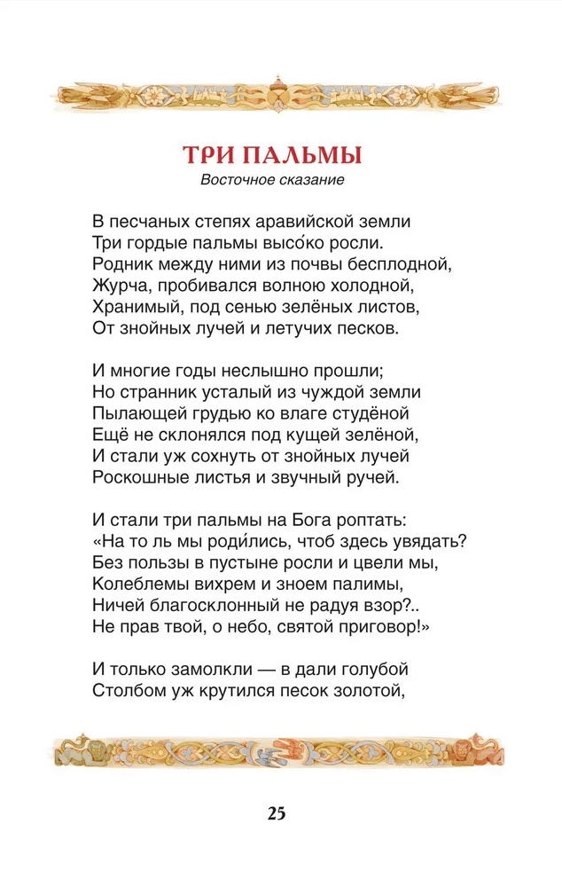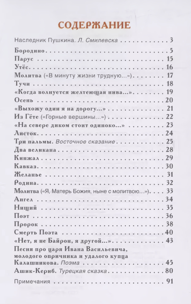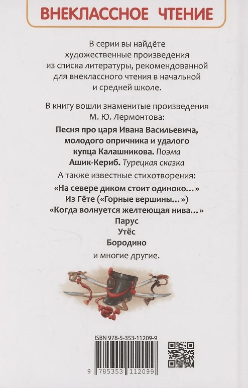 The book includes the works of Mikhail Yurievich Lermontov: the poem “Song about ... the merchant Kalashnikov”, the fairy tale “Ashik-Kerib” and the most famous poems: “The Rock”, “Sail”, “Clouds”, “From Goethe” (“Mountain peaks”), “When a yellowing field is worried ...”, “The Death of the Poet” and many others.