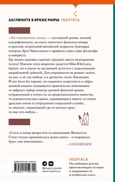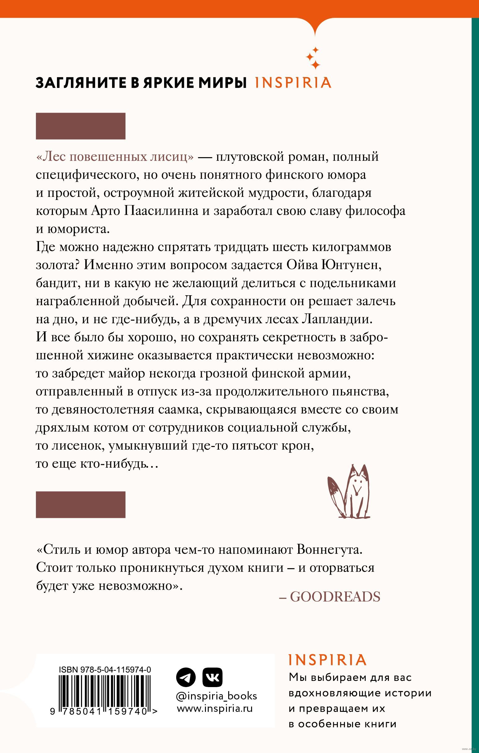 Arto Paasilinna's novels, written in vivid language, existing at the intersection of absurdity and reality, have become an important part of Finnish literature. What can unite a thief, a major in the Finnish army and a 90-year-old woman with a decrepit cat in the wild forests of Lapland? They each had their own reasons for wandering so far, but who knows, maybe fate didn't accidentally push them together? "The Forest of the Hanging Foxes" - a knave novel, full of specific, but very understandable Finnish humor and simple, witty worldly wisdom, thanks to which Arto Paasilinna and earned his fame as a philosopher and humorist.