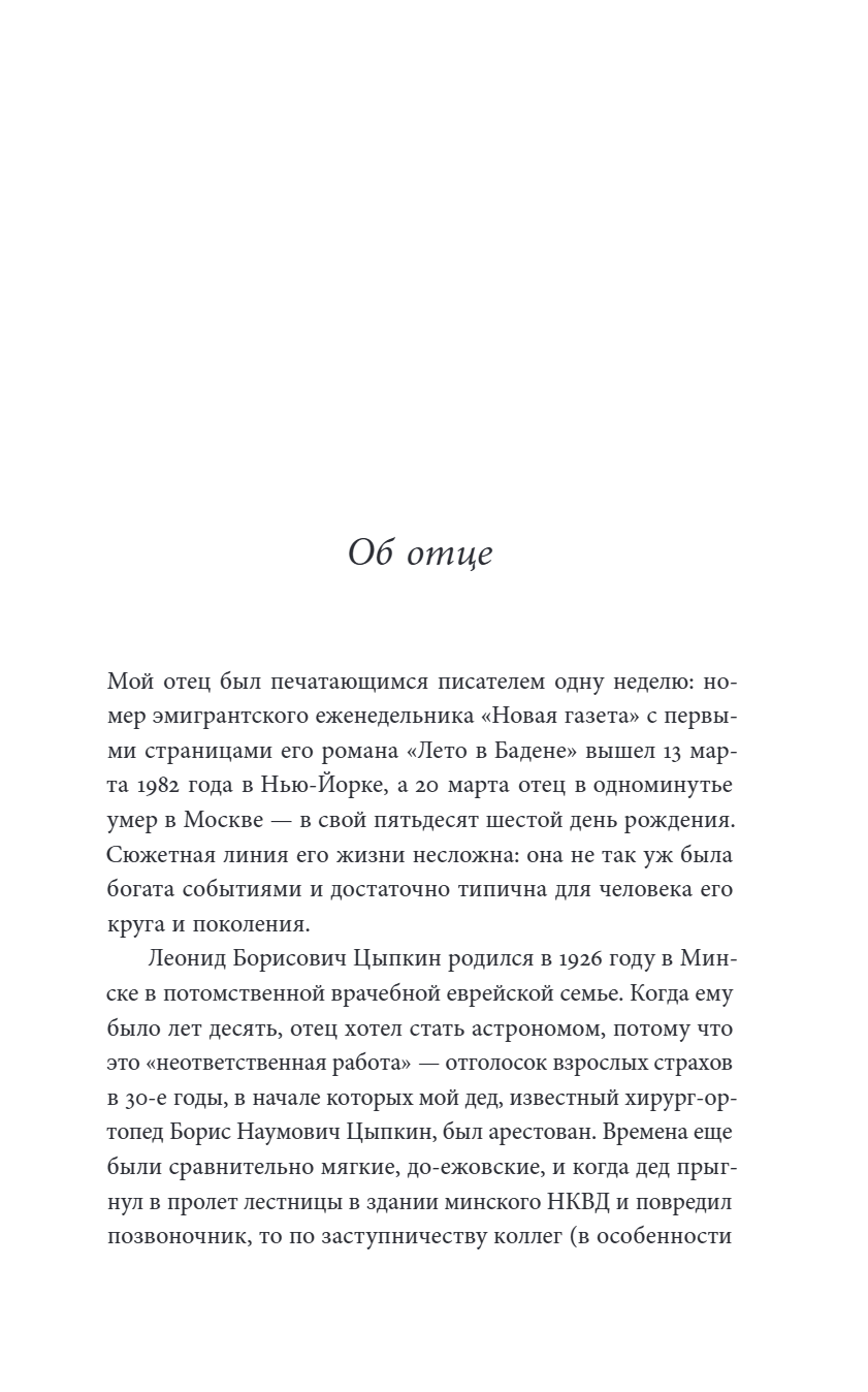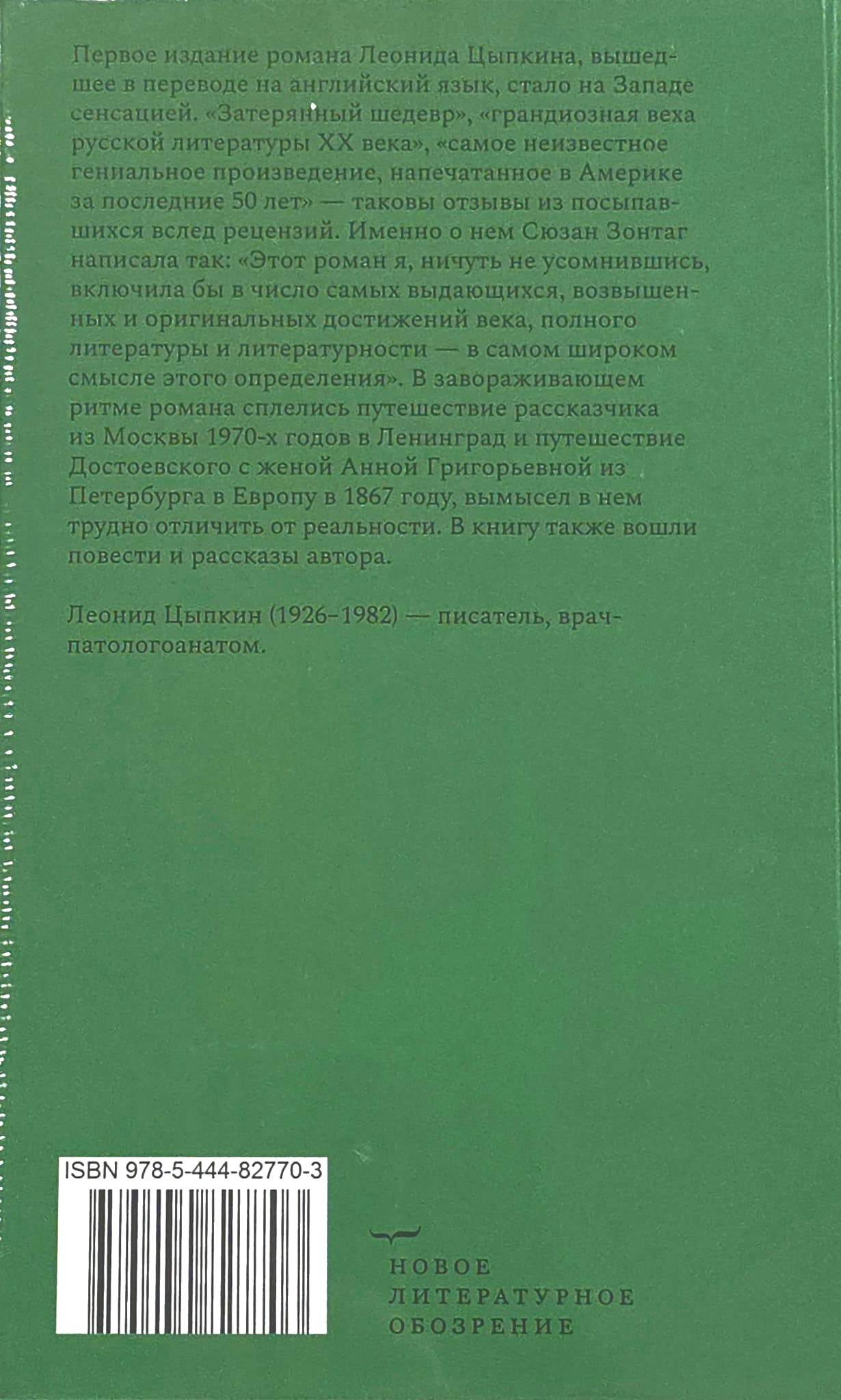 "I would, without a doubt, include this novel among the most outstanding, sublime, and original achievements of a century full of literature and literary values—in the broadest sense of the term," wrote the celebrated writer and philosopher Susan Sontag about Summer in Baden. Leonid Tsypkin is an underrated classic of Russian literature: his prose was only truly rediscovered in the 2000s. Summer in Baden, one of the crowning achievements of uncensored prose of the 1970s, does not fit into the established literary canon but rather redefines it, joining the ranks of such cult books as Moscow—Petushki by Venedikt Erofeev and School for Fools by Sasha Sokolov. The novel's captivating rhythm combines the narrator's journey from Moscow to Leningrad in the 1870s with Fyodor Dostoevsky and his wife, Anna Grigoryevna,'s travels across Europe in 1867. In addition to the novel "Summer in Baden," the book includes other works by Leonid Tsypkin, as well as his photographs of St. Petersburg sites associated with Dostoevsky.