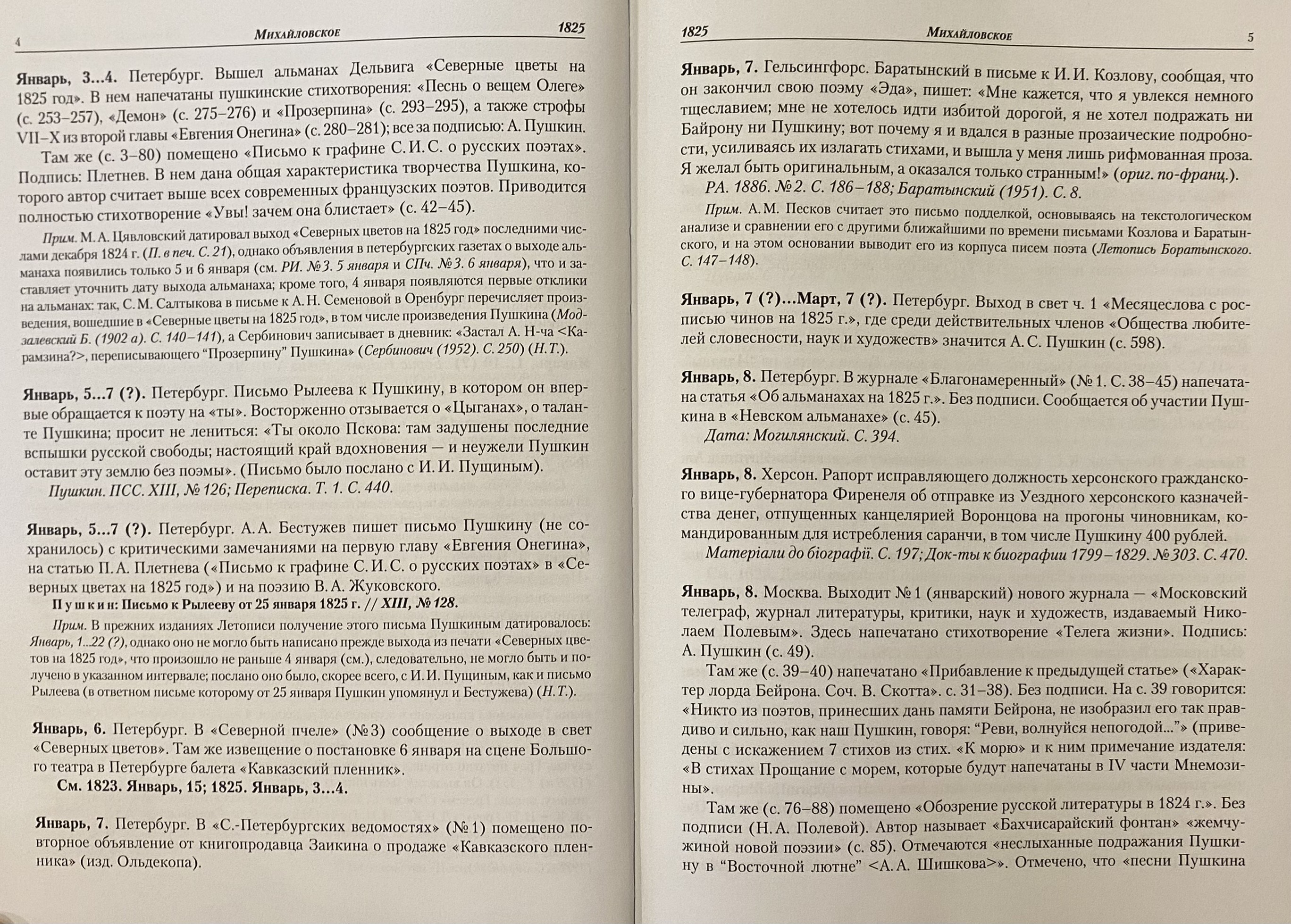 "The Chronicle of the Life and Work of A.S. Pushkin" (compiled by N.A. Tarkhova) belongs to the genre of a reference monographic publication common in Russian literary studies. It is a chronological collection of documents about Pushkin's life, supplied with archival and bibliographic references and detailed comments. Work on the Chronicle involves referring to all lifetime sources, both handwritten and printed, familiarity with the entire corpus of historical and biographical works about the life and work of the writer, as well as a careful selection of materials to eliminate legendary and unreliable information. As a rule, each article in the Chronicle is devoted to a separate event from the life of its character, and one date may include several articles devoted to events of various kinds, both creative and biographical. All chronicle articles are built on a single principle and contain diverse information: