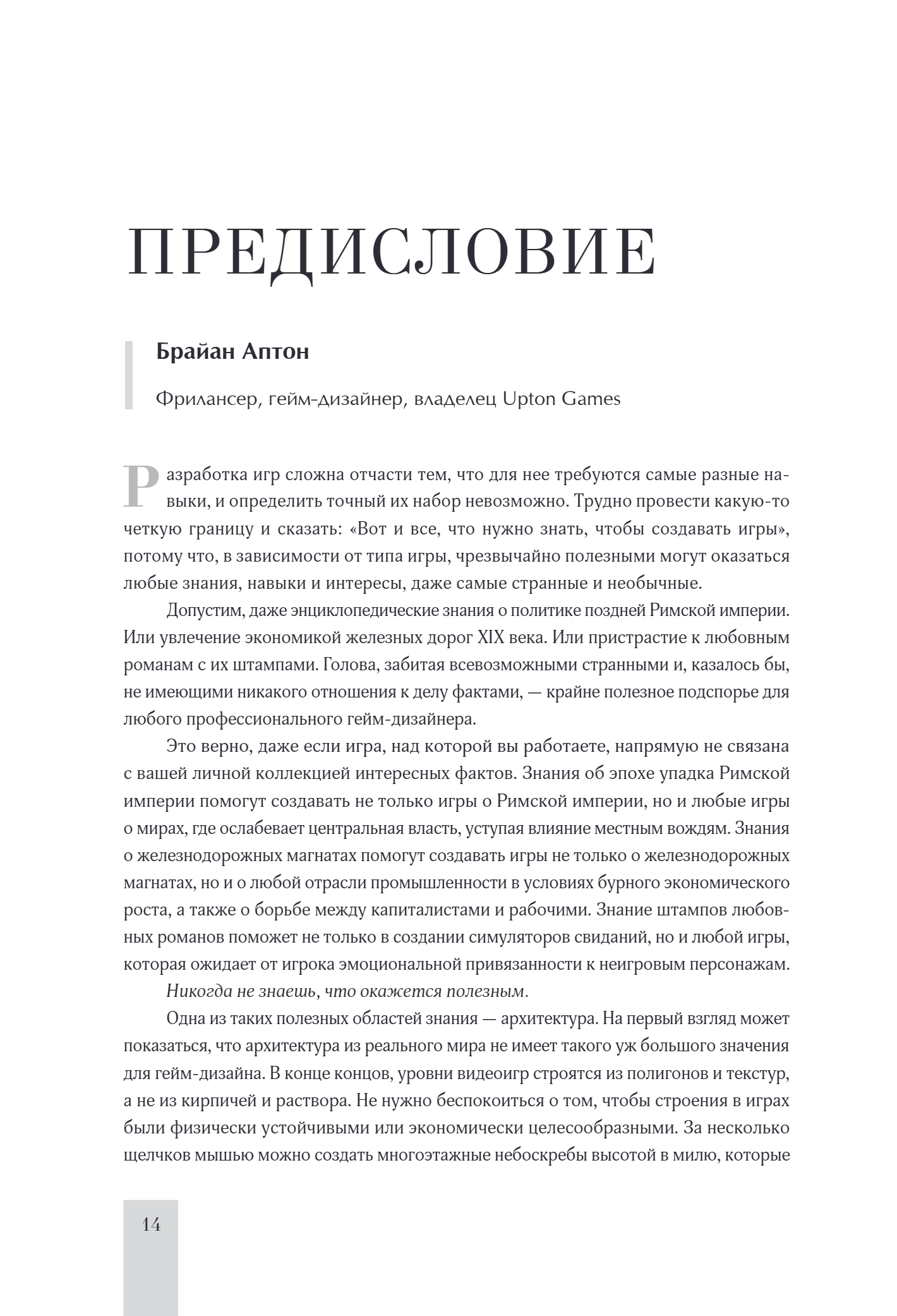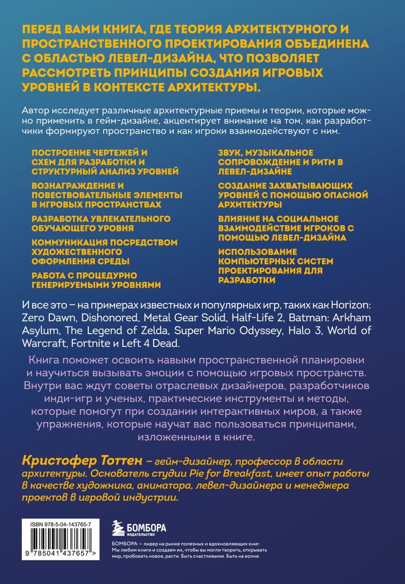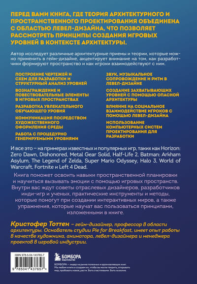 And all this is based on examples of famous and popular games such as Horizon: Zero Dawn, Dishonored, Metal Gear Solid, Half-Life 2, Batman: Arkham Asylum, The Legend of Zelda, Super Mario Odyssey, Halo 3, World of Warcraft, Fortnite and Left 4 Dead. The book will help you master the skills of spatial planning and learn how to evoke emotions with the help of game spaces. Inside you will find advice from industry designers, indie game developers and scientists, practical tools and methods that will help you when creating interactive worlds, as well as exercises that will teach you how to use the principles outlined in the book.