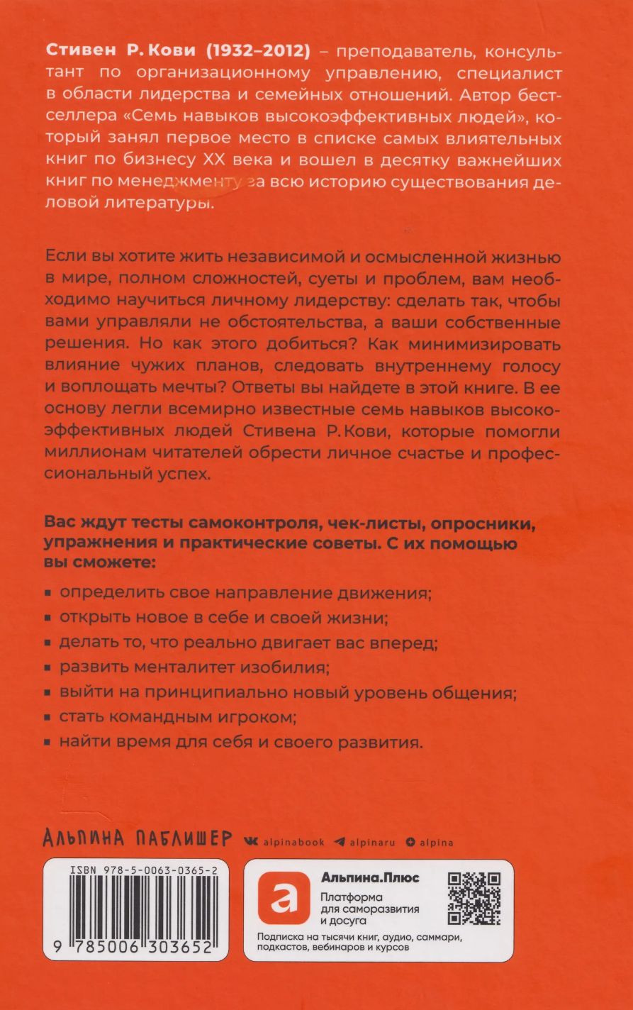 If you want to live an independent and meaningful life in a world full of complexity, fuss, and problems, you need to learn personal leadership: to be guided not by circumstances, but by your own decisions. But how can you achieve this? How can you minimize the influence of others' plans, follow your inner voice, and realize your dreams? You'll find the answers in Stephen R. Covey, author of the international bestseller "The 7 Habits of Highly Effective People." The principles he articulated have helped millions of readers find personal happiness and professional success. Tests, checklists, questionnaires, exercises, and advice will give you the courage to chart your own course, achieve your goals, and live the life you've always dreamed of.