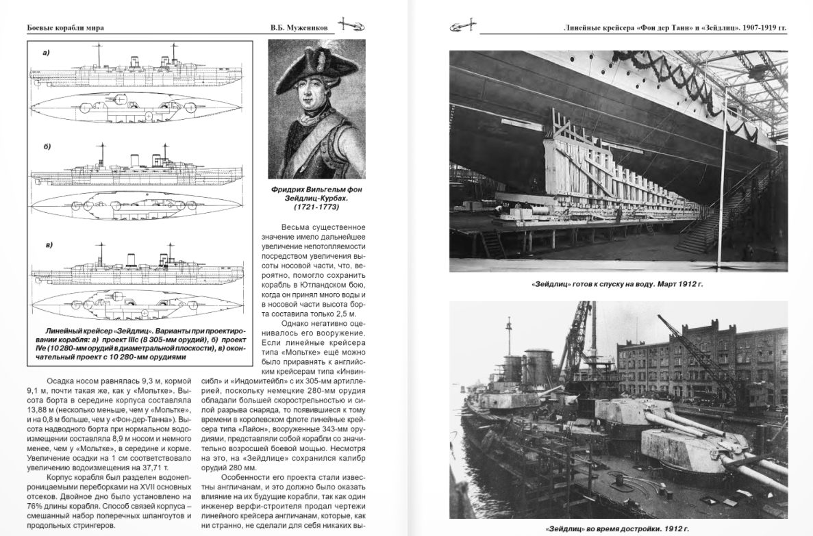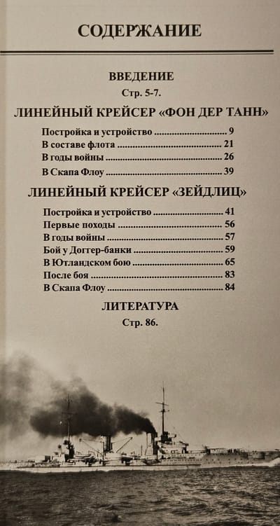 The book offered to the reader will tell about the heroic ships of the German fleet of the First World War - the large cruisers "Von der Tann" and "Seydlitz", which endured all the hardships of campaigns and battles with the English fleet and emerged victorious in the famous Battle of Jutland. These cruisers, according to the idea of German shipbuilders, were not only supposed to withstand the English battlecruisers, but also, if necessary, "take a hit" from the English battleships. In the line of large cruisers, the gap between the classic piston "Blücher" and the turbine "Von der Tann" is enormous. Increased by a third, including in relation to the main caliber - from 210 to battleship 280 mm, - and with armor comparable to battleships, the Von der Tann turned out to be the fastest cruiser in the world, developing, thanks to a steam turbine four-shaft installation, 28.1 knots. Starting with the next type of "Moltke", the armor indicators were sharpened, while maintaining the found 10-gun 280 mm standard and further increasing the speed. All this allowed the engineers to develop a project for the famous "Seydlitz", with a displacement that had grown by a third now compared to the "Von der Tann". During trials, it crossed the 29-knot threshold. 22 shells with a caliber of 12 to 15 dm were not enough to sink the valiant "Seydlitz", but the English cruiser "Queen Mary" needed only 36 minutes of battle with it...