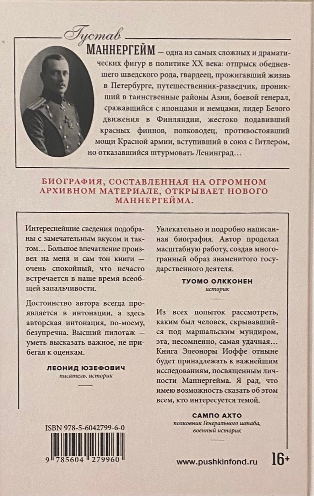 The book by the translator, publicist, and poet Eleonora Ioffe about Marshal Mannerheim is a revised edition, supplemented by an index of names.