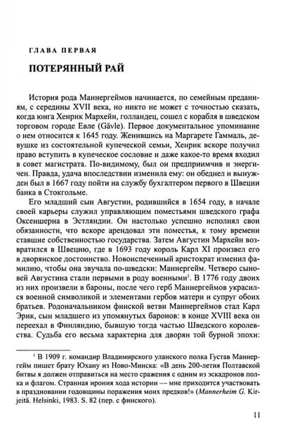 Gustav Mannerheim is one of the most complex and dramatic figures in 20th-century politics: the scion of an impoverished Swedish family, a guard who spent his life in St. Petersburg, a traveler and scout who penetrated the mysterious regions of Asia, a combat general who fought the Japanese and Germans, the leader of the White movement in Finland who brutally suppressed the Red Finns, a commander who resisted the might of the Red Army, entered into an alliance with Hitler, but refused to storm Leningrad. The biography, compiled on the basis of vast archival material, reveals a new Mannerheim.