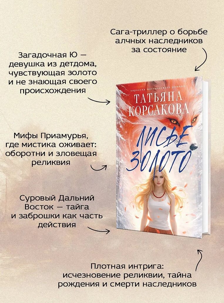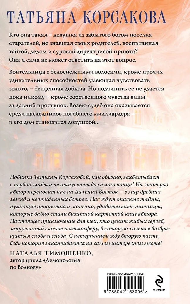 Who is she—a girl from a godforsaken mining village, who never knew her parents, raised by the taiga, her grandfather, and the stern headmistress of an orphanage? She herself can't answer this question. A warrior with snow-white hair, who, among other astonishing abilities, can sense gold—a priceless prize. But so far, no one has been able to subdue her—except her own sense of guilt for a long-ago offense. By a twist of fate, she finds herself among the heirs of a deceased billionaire—and his house becomes a trap...