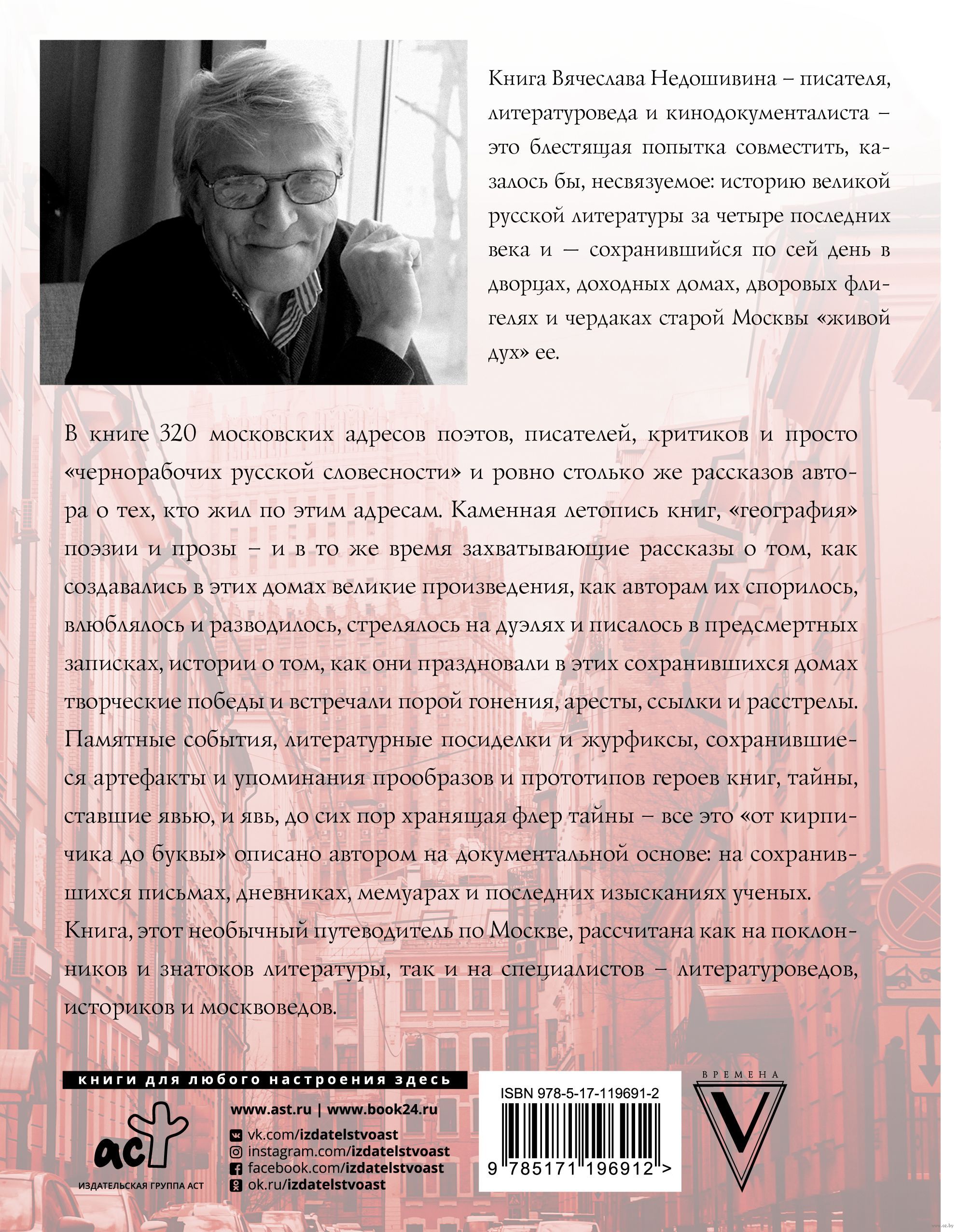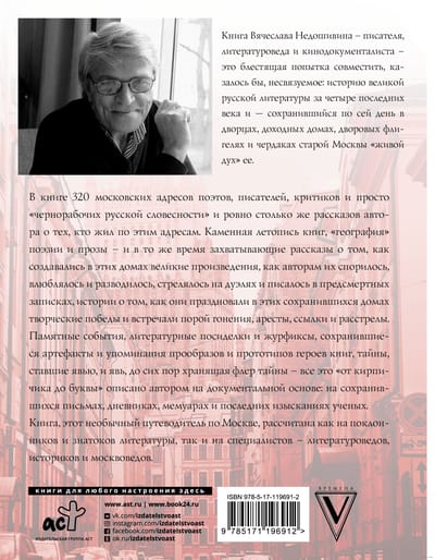 The book by Vyacheslav Nedoshivin - writer, literary critic and documentary filmmaker - is a brilliant attempt to combine seemingly unrelated things: the history of great Russian literature over the last four centuries and the "living spirit" of it preserved to this day in the palaces, tenement houses, courtyard wings and attics of old Moscow. The book contains 320 Moscow addresses of poets, writers, critics and just "laborers of Russian literature" and exactly the same number of stories of the author about those who lived at these addresses. A stone chronicle of books, "geography" of poetry and prose, and at the same time - fascinating stories about how great works were created in these houses, how their authors argued, fell in love and divorced, were shot at duels and wrote in suicide notes, stories about how they celebrated creative victories in these preserved houses and met sometimes persecution, arrests, exiles and shootings. Memorable events, literary gatherings and journals, surviving artifacts and references to the prototypes and prototypes of the book's heroes, secrets that have come true and the reality that still retains a veil of mystery - all this "from brick to letter" is described by the author on a documentary basis: on surviving letters, diaries, memoirs and the latest research of scholars. The book, this unusual guide to Moscow, is intended both for fans and connoisseurs of literature, and for specialists - literary critics, historians and Muscovites.
