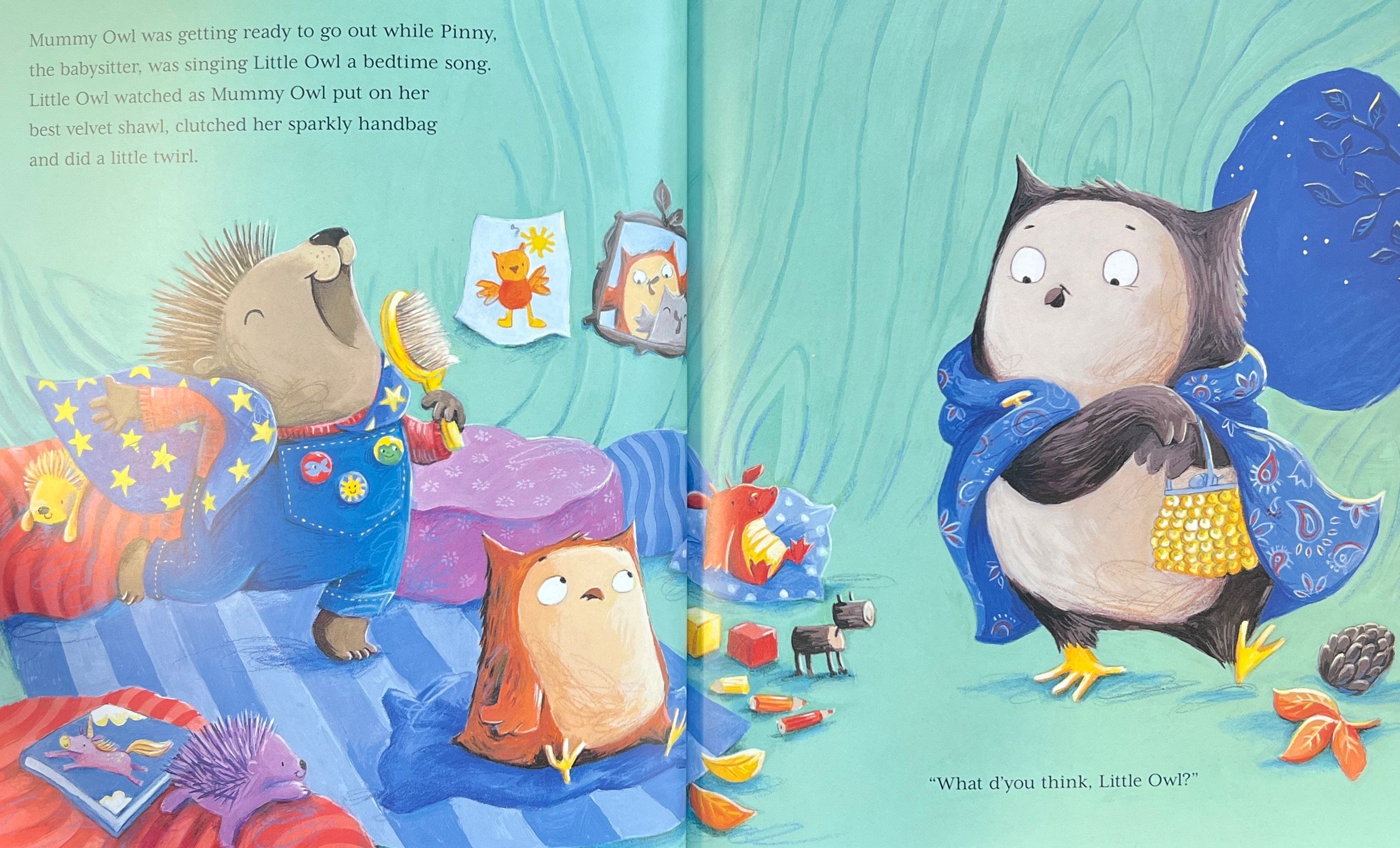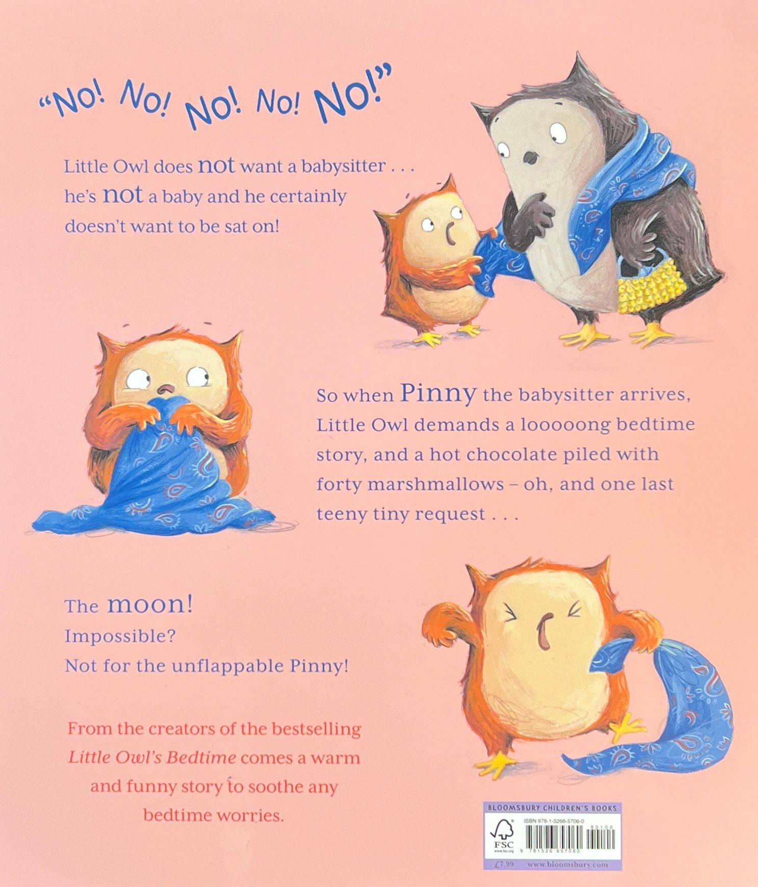 Little Owl does NOT want a babysitter … he's not a baby and he certainly doesn't want to be sat on. When Pinny the babysitter arrives, Little Owl wants a long bedtime story and a hot chocolate with forty marshmallows – and he mustn't forget to say goodnight to ALL his toys, about a millionty billion of them.