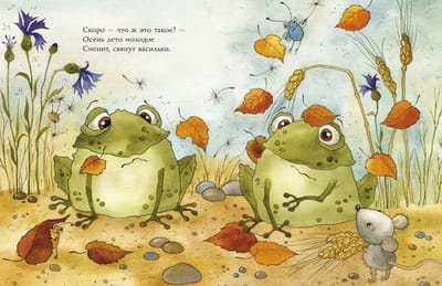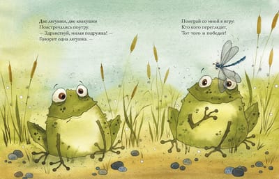 Two frogs started a staring contest early one summer morning. Who would outshine the other? It was lunchtime—they were still staring at each other. A thunderstorm blew and rumbled—the frogs weren't giving up. Autumn was already approaching—would the frogs really just sit there in the middle of the river, and not give up their game?