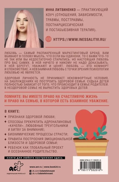 The author dispels the clichés and stereotypes that shape our understanding of love. She reveals what healthy relationships really look like and, most importantly, how to build them. You'll understand where you've made mistakes and be able to create a happy union free from pain, fear, and damaged self-esteem. You'll learn to build a dialogue with your partner and parents based on respect, trust, and sober assessment. This book is also essential for expectant mothers and fathers who want to raise their children to be independent and free individuals.