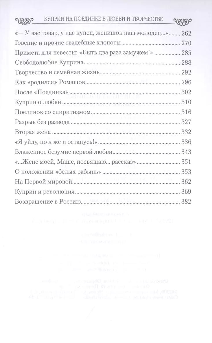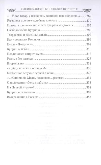 The book reveals the secrets of the creation of famous works by Alexander Kuprin - "The Pit", "Pomegranate Bracelet", "Junkers". Much space in this edition is devoted to the famous story "Duel", in which the writer tells not only about the duel of Lieutenant Romashov and Captain Nikolaev, but also about many duels that occurred throughout his life, in love, marriage, army service and creativity.