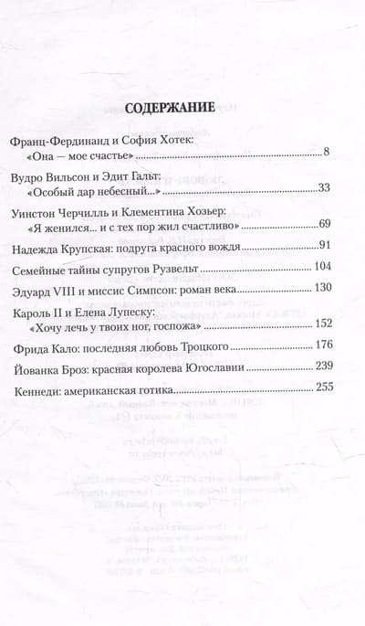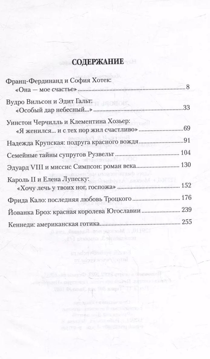 The reader is waiting for the love stories of politicians of the twentieth century. These are Franz Ferdinand and Sophia Hotek, Woodrow Wilson and Edith Galt, Winston Churchill and Clementine Hozier, Carol II and Elena Lupescu, Frida Kahlo and Lev Trotsky....