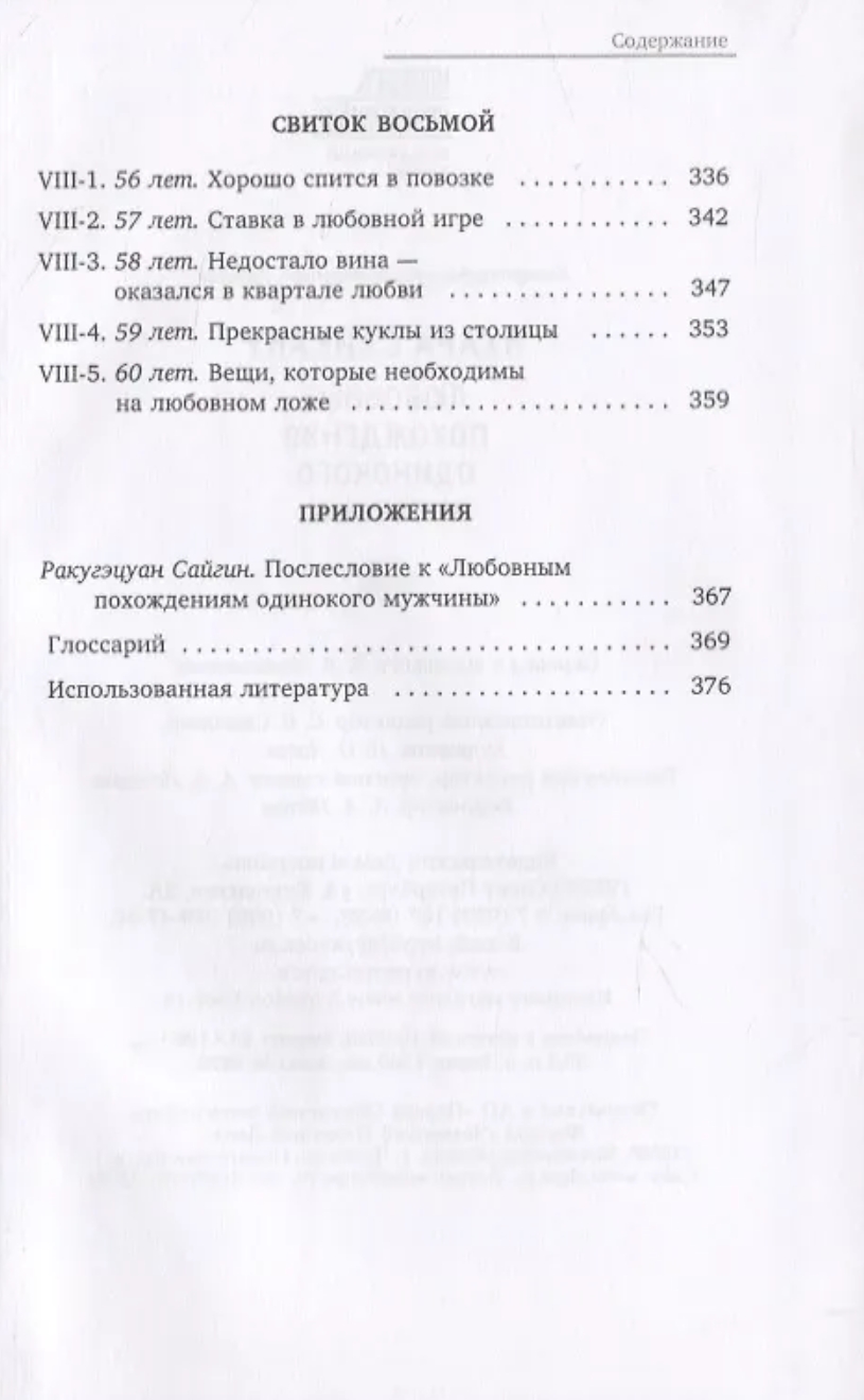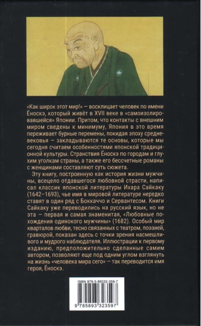 Saikaku's books have been translated into Russian before, but not this one—his first and most famous, "The History of the Loves of a Solitary Man" (1682). The unique world of love quarters, closely linked to theater, poetry, and printmaking, is revealed here from the perspective of a witty and wise observer. The illustrations to the first edition, presumably by the author himself, offer yet another perspective on the life of a "man of this world"—as the hero's name, Yonosuke, is translated.