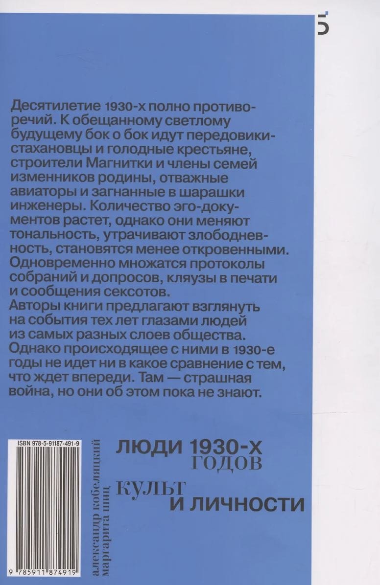 The decade of the 1930s is full of contradictions. Stakhanovite pioneers and starving peasants, Magnitka builders and family members of "traitors to the motherland," courageous aviators and engineers forced into sharashkas (labor camps) march side by side toward the promised bright future. The transition from the joys of life to the rations of a prison camp takes very little time. The number of ego documents grows, but they change tone, lose their relevance, and become less revealing. At the same time, minutes of meetings and interrogations, press denunciations, and informant reports proliferate. The authors of the book offer a look at the events of those years through the eyes of people from all walks of life. However, what happened to them in the 1930s pales in comparison to what lies ahead. There is a terrible war out there, but they don't know it yet.