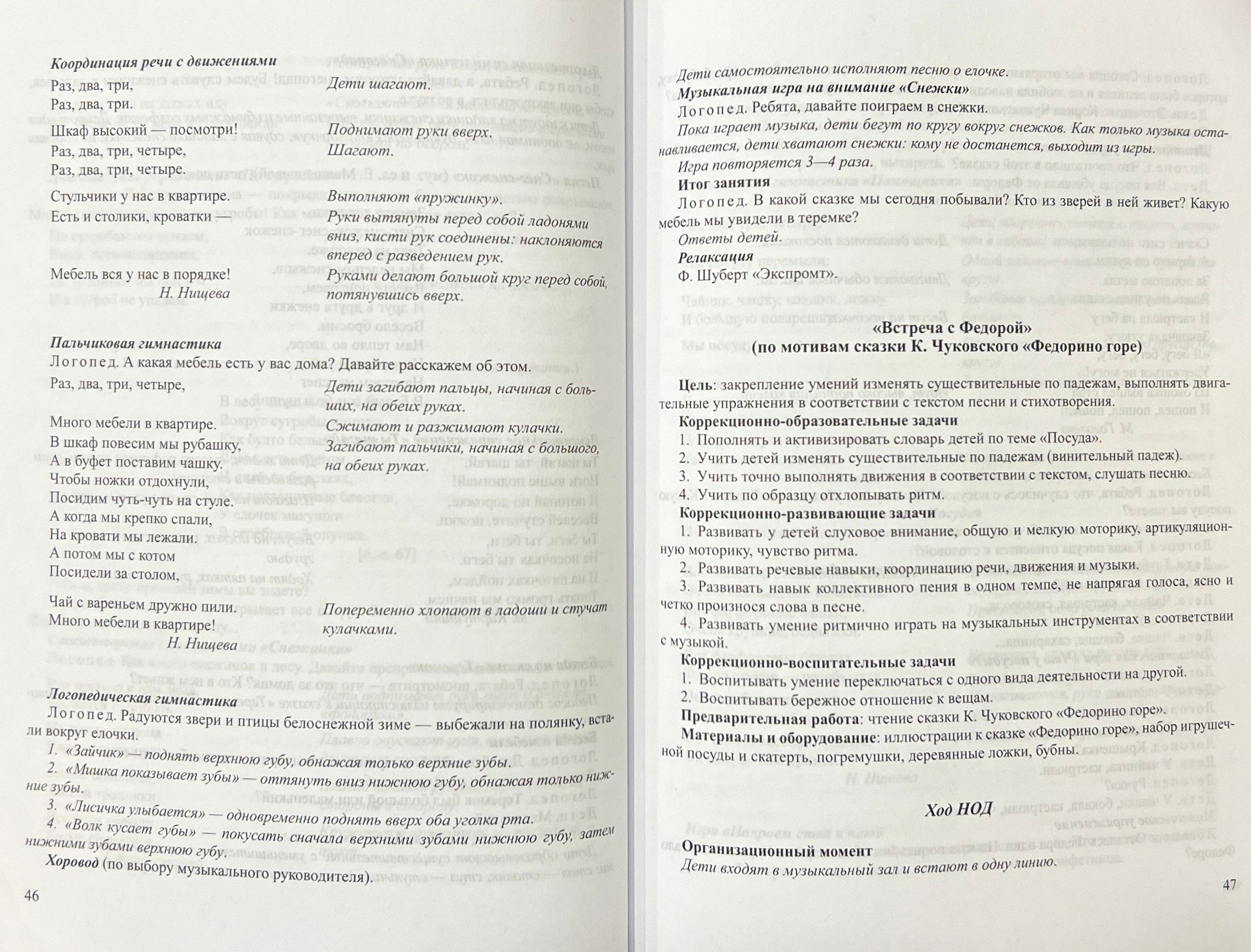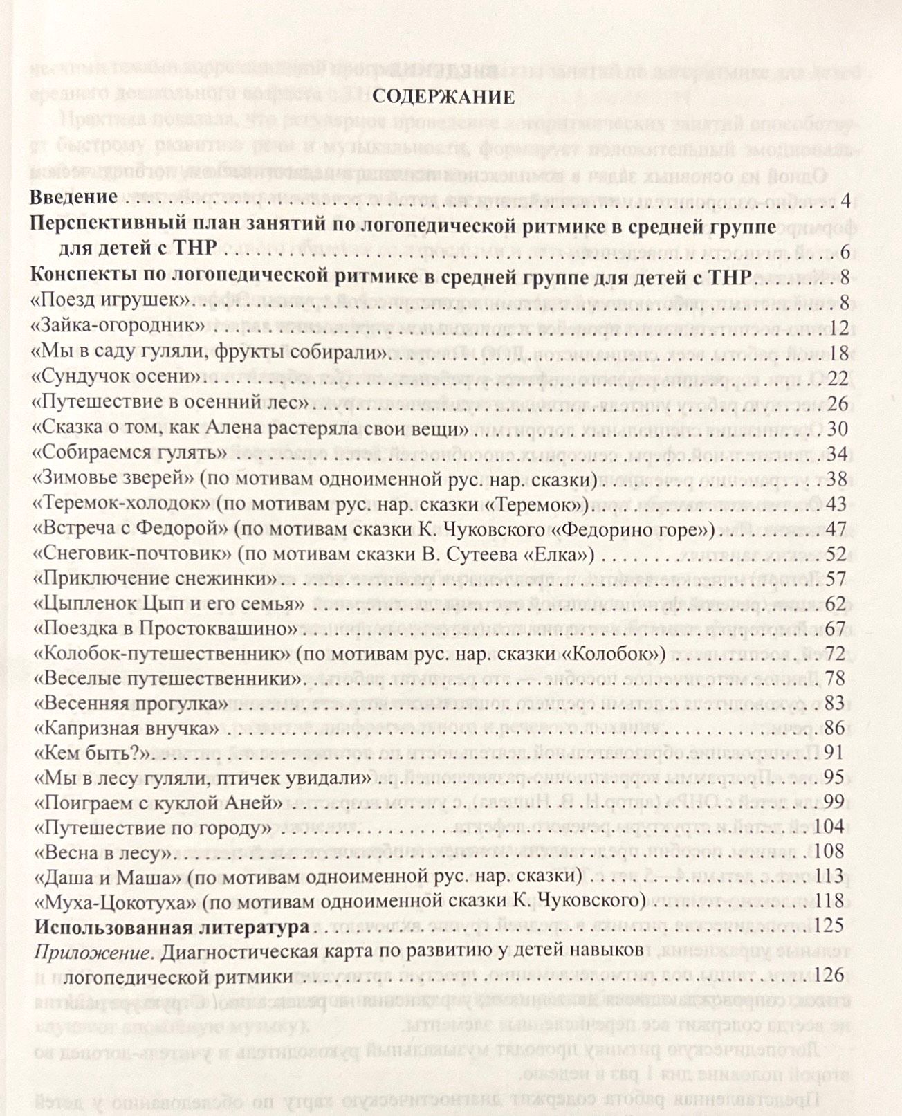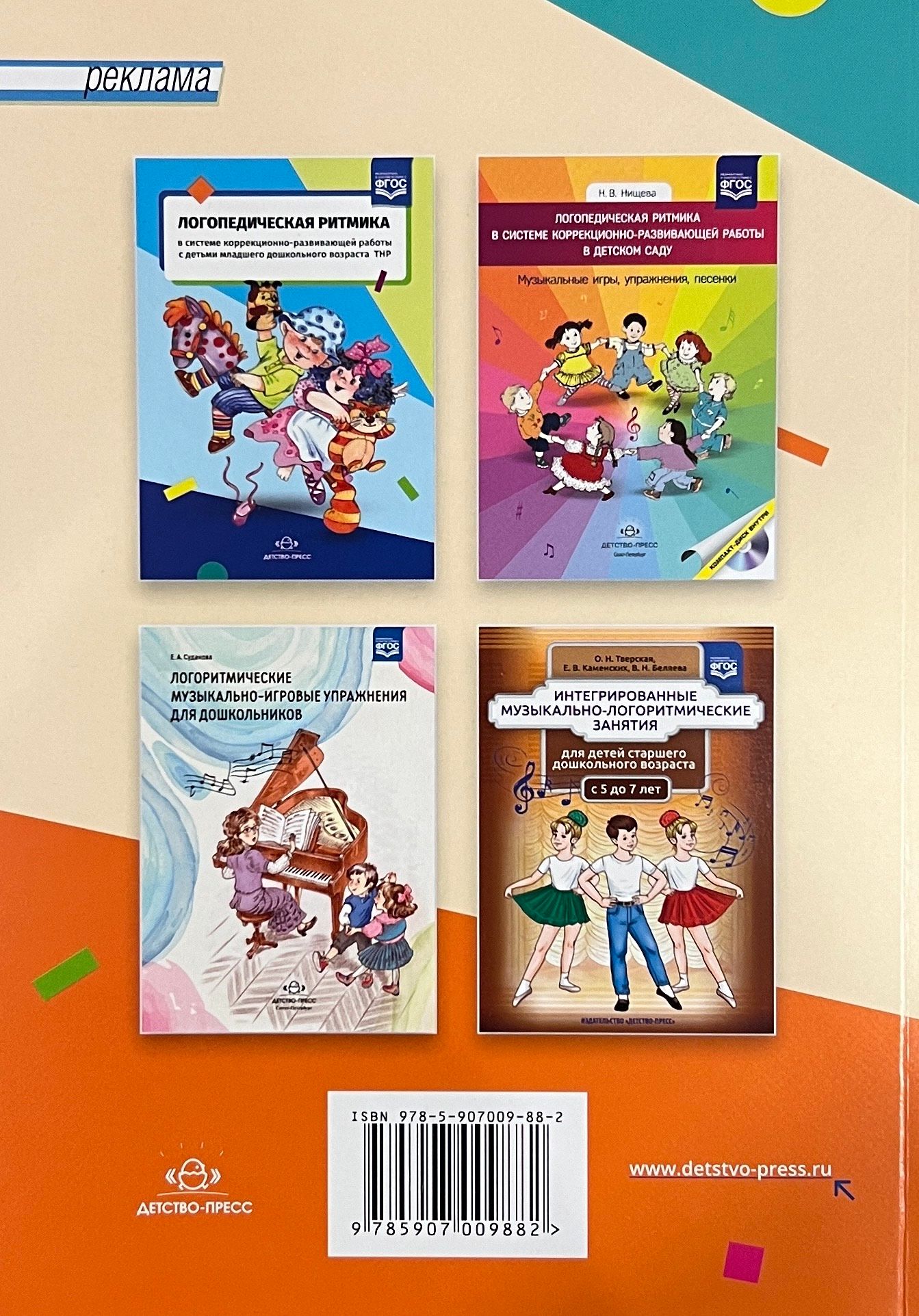 The methodological manual contains a set of logorithmic lessons, a prospective work plan and a diagnostic card for examining the skills of speech therapy rhythmics of children aged 4-5 with speech impairment. The complex of lessons is built on a fairy tale plot in accordance with the studied lexical topics. Logoritmic lessons in the middle group include movement, speech and breathing exercises, finger and moving games, exercises for the development of attention and memory, dancing to the rhythmodeclamation, simple articulation gymnastics, songs and poems accompanied by movements, relaxation exercises. The manual is addressed to music directors, teachers, speech therapists, educators and other teachers working with children of middle preschool age in mass and correctional groups of kindergarten.