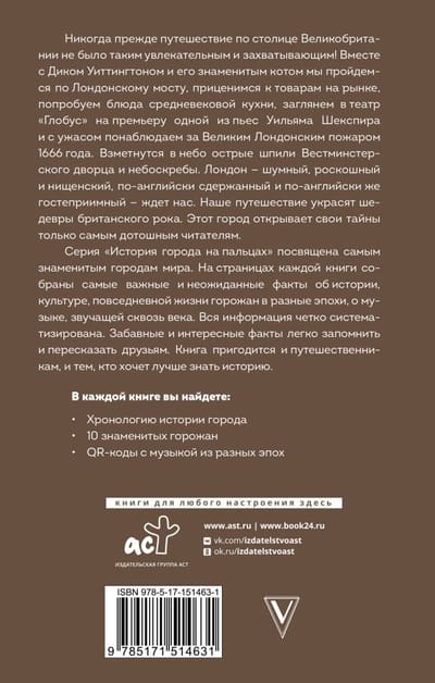 Never before has traveling through the capital of Great Britain been so exciting and thrilling! Together with Dick Whittington and his famous cat, we'll walk across London Bridge, check out the market, taste medieval cuisine, visit the Globe Theater for the premiere of one of William Shakespeare's plays, and watch the Great Fire of London in 1666 in horror. The sharp spires of the Palace of Westminster and skyscrapers soar into the sky. London - noisy, luxurious and poverty-stricken in the English way of restraint and English hospitality awaits us.Our journey will be decorated with masterpieces of British rock. This city reveals its secrets only to the most meticulous readers.The series "City History on Your Fingers" is dedicated to the most famous cities of the world. On the pages of each book are collected the most important and unexpected facts about history, culture, about the daily life of citizens in different eras, about the music that sounds through the ages. All information is clearly systematized. Funny and interesting facts are easy to memorize and retell to friends. The book will be useful for travelers and those who want to know their history better.In each book you will find: