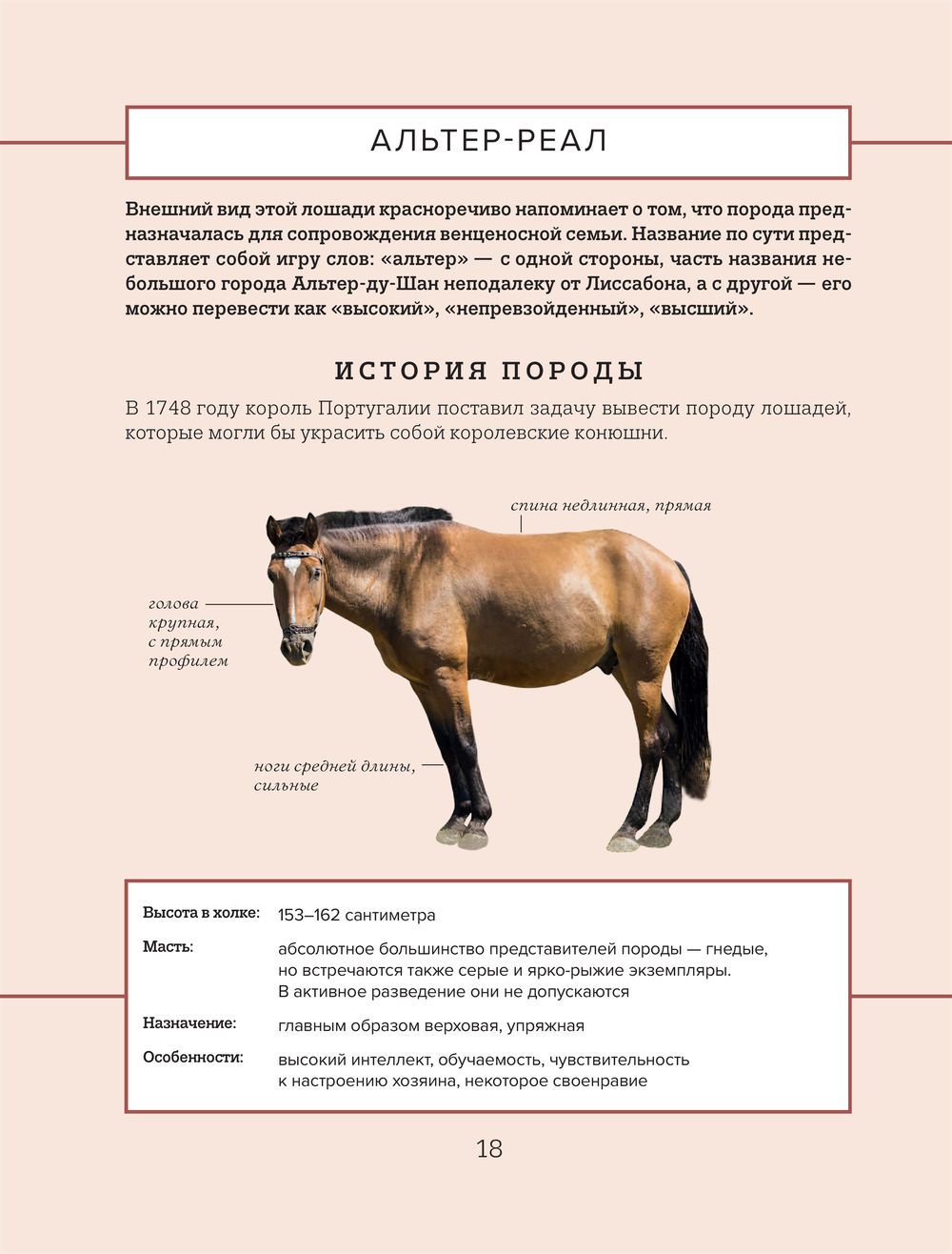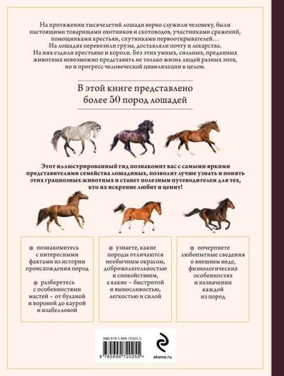 Intelligent, strong and loyal, the epitome of true majesty, nobility and grace! Horses have been with us for centuries. Without them would be unthinkable and great conquests, and famous sports victories, and the industrial revolution, and the conquest of new lands. It is impossible to imagine not only the lives of people of different eras, but also the progress of human civilization as a whole. This illustrated guide will introduce you to the most colorful representatives of the horse family, will allow you to better know and understand these graceful animals and will become a useful guide for those who truly love and appreciate them!