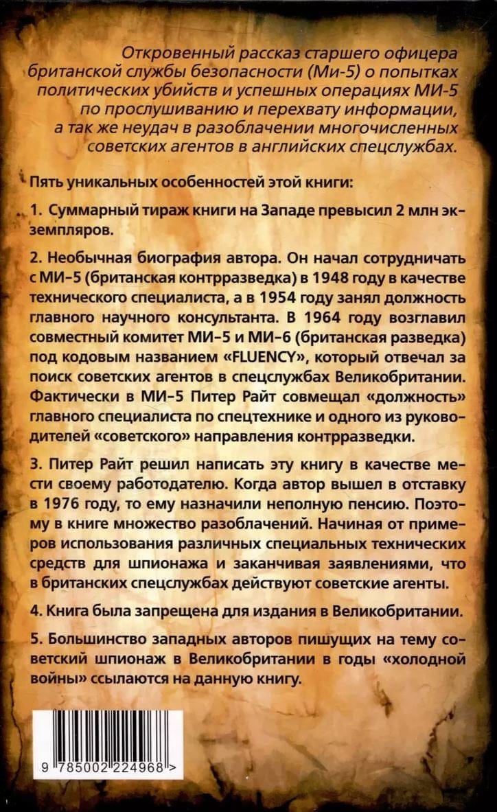 In 1985, Peter Wright, former assistant director of the British security service MI5, published his account of his 28 years of service with the agency. He gave a detailed and authentic account of political assassination attempts and MI5's wiretapping and interception operations. The author paid special attention to the topic: Soviet agents in the British intelligence services. The British government's aggressive campaign to ban this book has ensured its perennial popularity. It has been published everywhere except England. The total circulation of this book has exceeded 2 million copies. All Western authors writing on the subject of Soviet espionage are sure to refer to and cite this work.