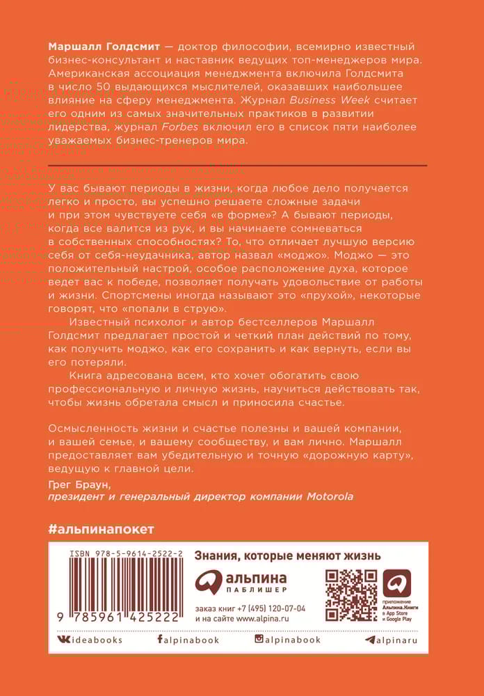 Do you have periods in your life when everything comes easy and simple, you successfully solve complex problems and you feel "in shape"? And are there times when everything falls apart and you begin to doubt your own abilities? What separates the best version of yourself from the underdog is what the author calls "mojo." Mojo is a positive attitude, a special disposition that leads you to victory and allows you to enjoy your work and life. Athletes sometimes call it "mojo", some say they "hit the flow". Renowned psychologist and best-selling author Marshall Goldsmith offers a simple and clear action plan on how to get mojo, how to keep it, and how to get it back if you lose it. The book is aimed at anyone who wants to be the best version of themselves more often.