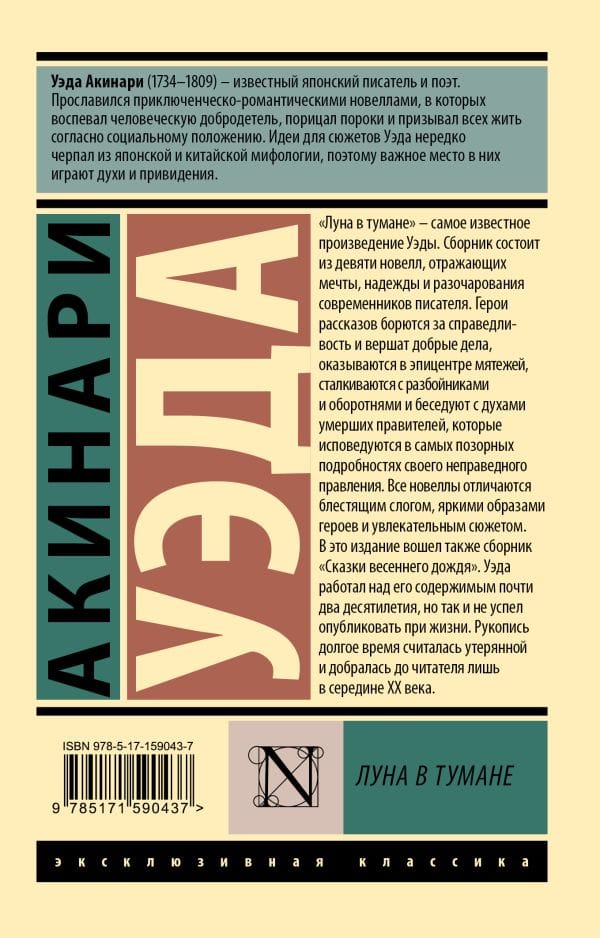 "Moon in the Mist" is Ueda's most famous work. The collection consists of nine short stories reflecting the dreams, hopes and disappointments of the writer's contemporaries. The heroes of the stories fight for justice and do good deeds. find themselves in the epicenter of rebellions. face robbers and werewolves and talk to the spirits of dead rulers. who confess the most shameful details of their unjust rule. All the novellas are characterized by a brilliant syllable. vivid images of the characters and a fascinating plot.