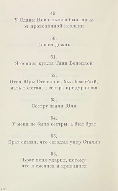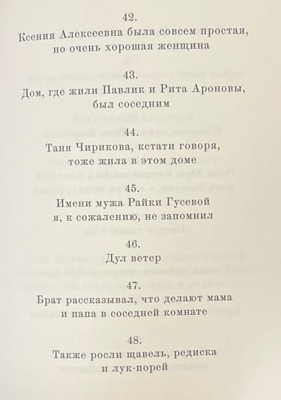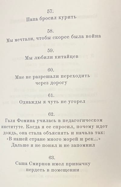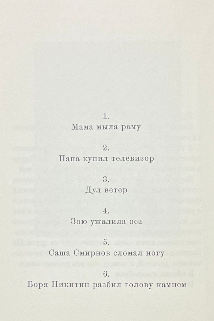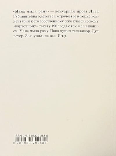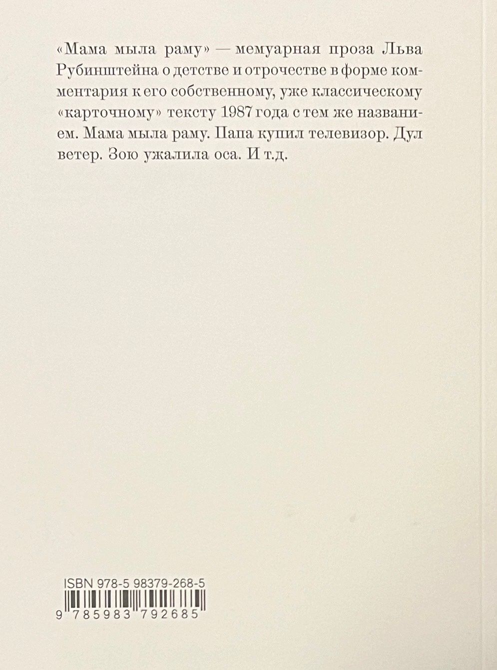 "Mama Washed the Frame" is Lev Rubinstein's memoir prose about childhood and adolescence in the form of a commentary on his own, already classic 1987 "card" text of the same title. Mom was washing the frame. Dad bought a television set. The wind was blowing. Zoya was stung by a wasp. And so on.