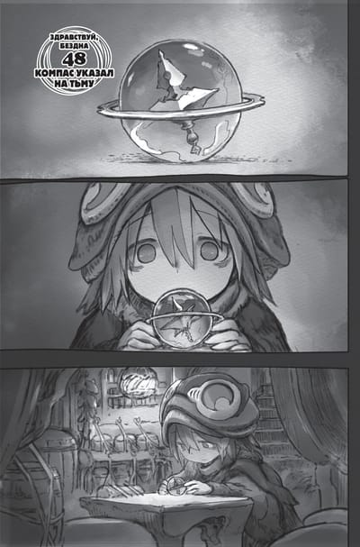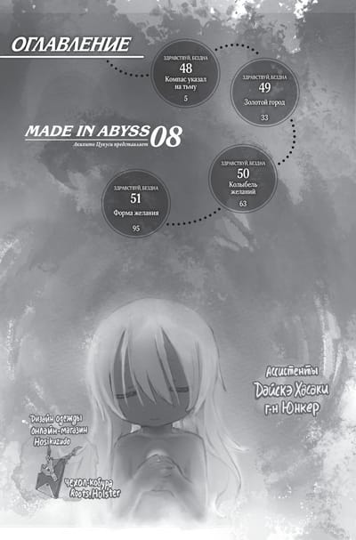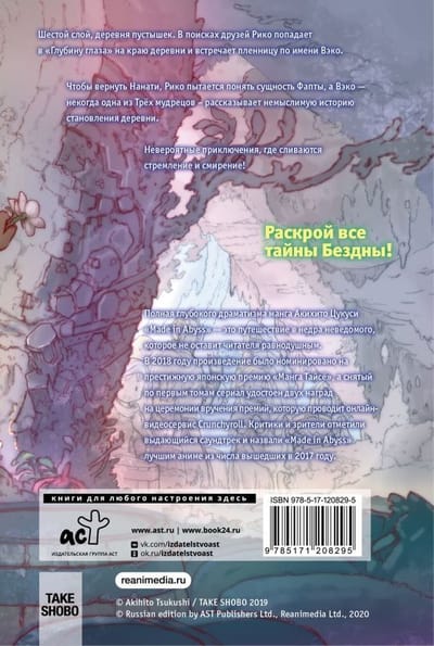 Layer Six, Village of Pacifiers. While searching for friends, Riko enters the "Depths of the Eye" at the edge of the village and meets a captive named Veko. To get Nanati back, Rico tries to understand the essence of Phapta, and Veko - once one of the Three Sages - tells the unthinkable story of how the village came to be. Incredible adventures where striving and humility merge - in volume eight!