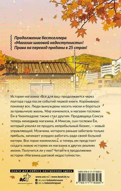 The story of the convenience store "Everything for You" continues a year and a half after the events of the first book. The coronavirus has changed everything. People are forced to wear masks and fight for their normal lives. The world has changed, and Mrs. Yeom's store in Cheongpa-dong has also changed. The saleswoman Seongsuk is now the store manager. And Minsik, Mrs. Yeom's son, who begged her to sell the unprofitable business, is the new manager. The man who previously cared only about profit begins to work hard for the sake of his sick mother. All the characters have changed, and now they have to create a new story for their store in other realities of life. Will they succeed? Read on in the continuation of the story of "Convenience Store".