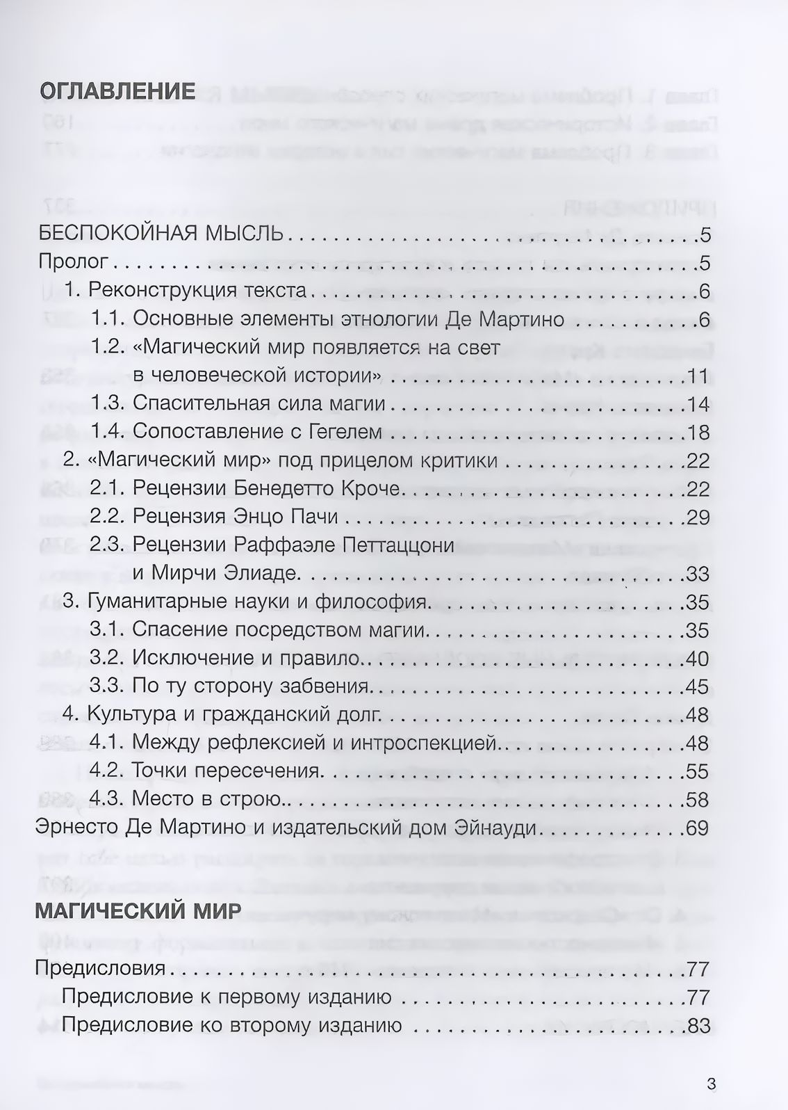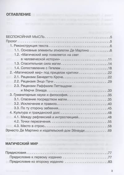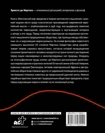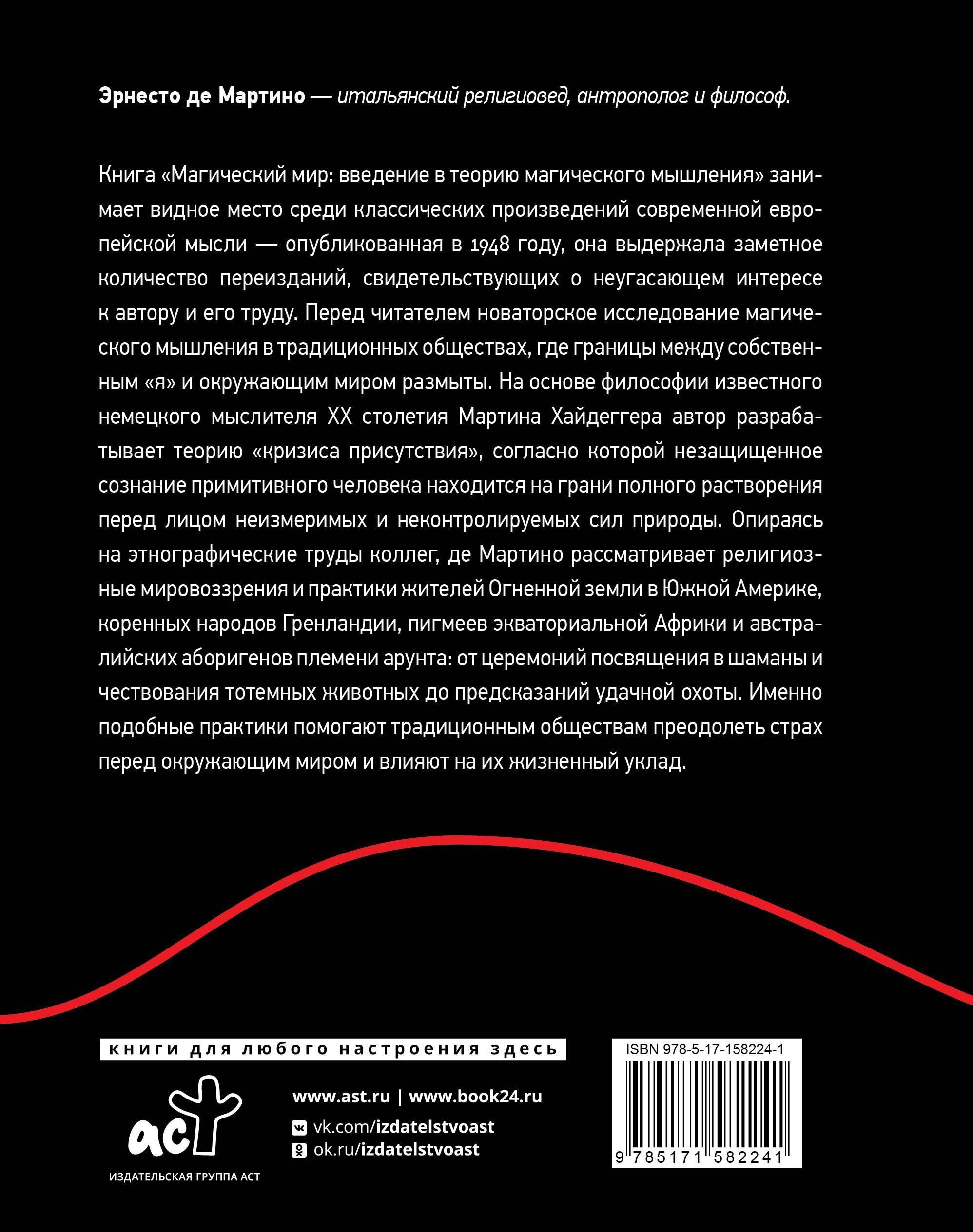 The book "The Magical World: An Introduction to the Theory of Magical Thinking" occupies a prominent place among the classic works of modern European thought - published in 1948, it has withstood a significant number of reprints, testifying to the undying interest in the author and his work. Before the reader is a pioneering study of magical thinking in traditional societies, where the boundaries between the self and the surrounding world are blurred. Based on the philosophy of the famous German thinker of the 20th century Martin Heidegger, the author develops a theory of the "crisis of presence", according to which the unprotected consciousness of primitive man is on the verge of complete dissolution in the face of immeasurable and uncontrollable forces of nature. Drawing on the ethnographic work of his colleagues, de Martino examines the religious worldviews and practices of the inhabitants of Tierra del Fuego in South America, the indigenous peoples of Greenland, the pygmies of equatorial Africa, and the Australian Arunta aborigines: from shaman initiation ceremonies and honoring totem animals to predicting successful hunting. It is precisely such practices that help traditional societies overcome their fear of the outside world and influence their way of life.
