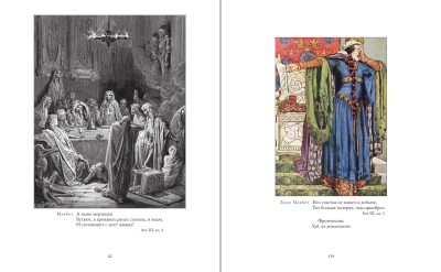 The supplementary volume unfolds a broad visual history of Macbeth. The first part features works by fourteen European and American artists, created in a wide range of styles—from Victorian graphics and Gustave Doré's engravings to the phantasmagorias of Salvador Dalí and the realistic works of Louis Reed. The second part shows how the images of Shakespeare's heroes have changed over three centuries in painting, sculpture, engraving, and lithography. Macbeth is portrayed at times as a mad tyrant, at others as a tragic and pensive character; Lady Macbeth—at times a fragile noblewoman, at others as a stern and almost demonic figure. The third part brings together portraits and photographs of outstanding actors from the world theater, as well as set designs, prop sketches, and historical costumes. The appendix includes political cartoons and advertising images that demonstrate how the images of Macbeth entered popular culture and became part of the European visual language.