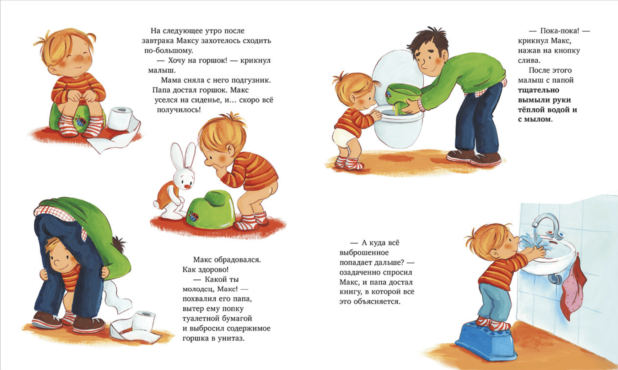 Max is a cheerful little rascal who dreams of exploring the world around him. Every day, he learns a little bit about everything: how to brush his teeth, how to dress himself… In this book, Max will learn how to use the potty and important hygiene rules.