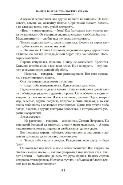 The edition includes a complete collection of Ural tales by P. Bazhov: "Stone Flower", "Malachite Box", "Copper Mountain Mistress", "Silver Hoof" and others, as well as autobiographical stories "Green Mare", "Far - Close" and a collection of "Ural Tales", based on memories of the Ural life and childhood years of the writer.