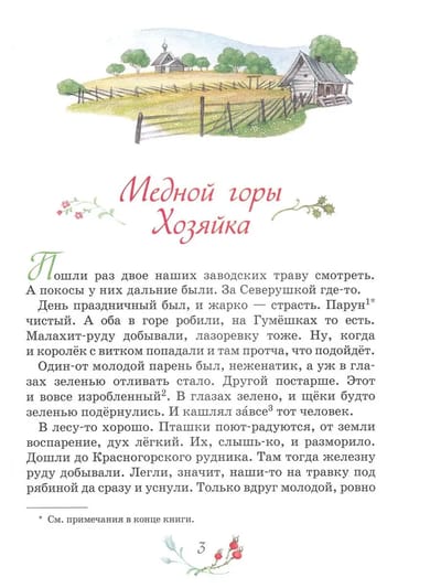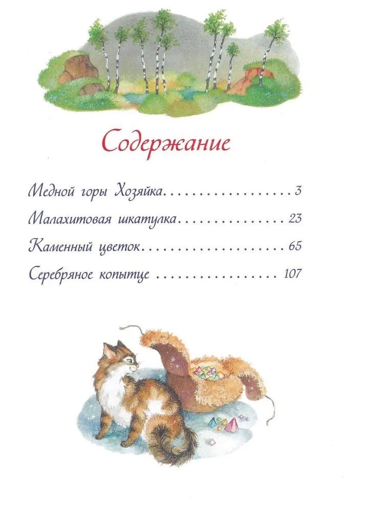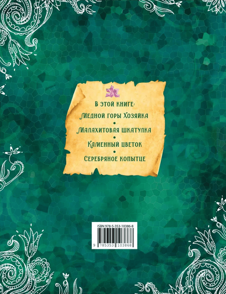 The book includes the best tales created by the famous writer and folklorist Pavel Bazhov: "The Mistress of Copper Mountain", "Malachite Box", "Stone Flower" and "Silver Hoof". They bring to life the mysterious world of the Ural nature, full of secrets, riddles and unique charm.