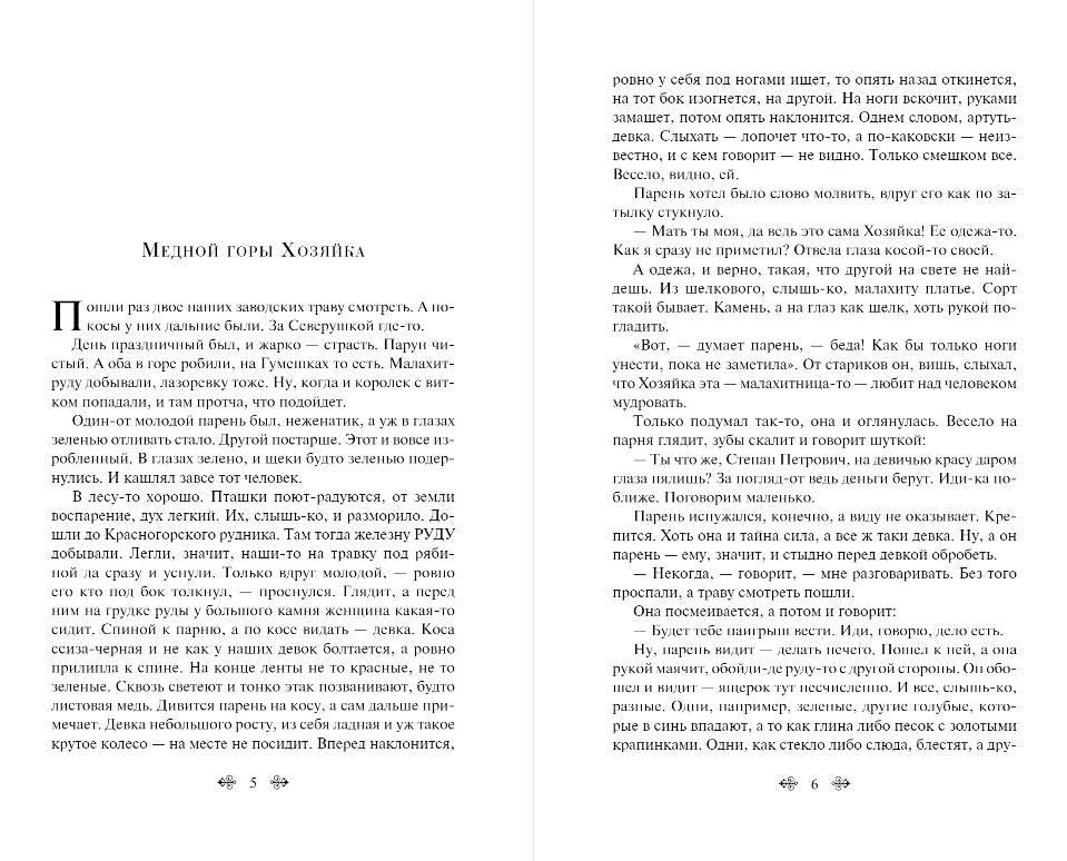 The collection “Malachite Box” contains tales about prospectors and master stone-cutters who meet with mythological creatures and spirits of the Ural places, who either help skillful workers, then play tricks and test them for strength.