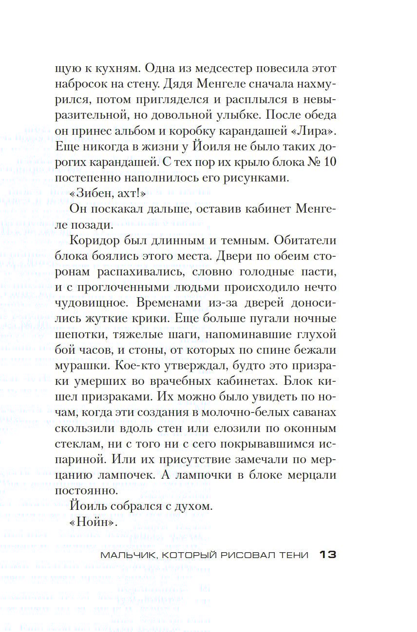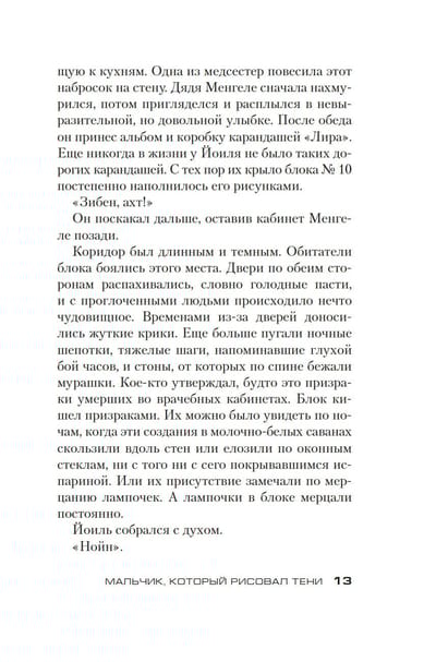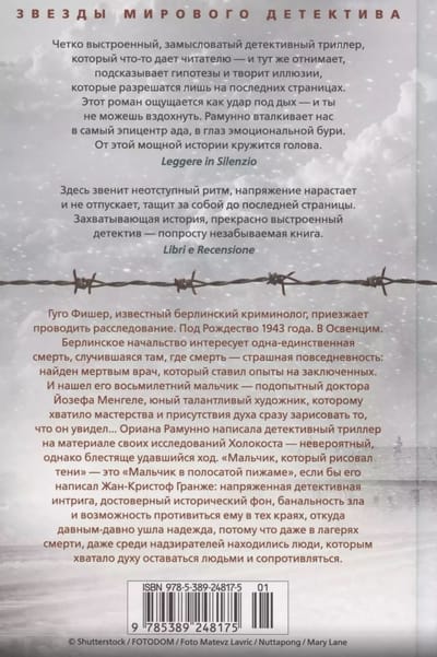 Hugo Fischer, a renowned criminologist, arrives to investigate. On Christmas Day, 1943. To Auschwitz. Hugo had spent the previous ten years in Berlin, where the events in the concentration camps were largely ignored: terrible rumors were spread around the city, of course, but reasonable people wouldn't believe rumors, would they? And now Hugo is faced with a horror for which he, a man who is not evil and by no means a fighter, is not at all prepared. Meanwhile, the Berlin authorities are interested in a single death, which happened where death is a terrible everyday occurrence: a doctor who experimented on prisoners was found dead. And he was found by an eight-year-old boy - a test subject of Dr. Josef Mengele, a young talented artist who had the skill and presence of mind to immediately sketch what he saw. A Jewish child from Bologna, a criminologist from the Berlin criminal police who has something to hide - a strange duo investigating a strange death in a terrible land - and a whole host of possible suspects, also each hiding a secret of their own. Oriana Ramunno has written a detective thriller based on her Holocaust research - an improbable but brilliantly successful move. "The Boy Who Painted Shadows" is "The Boy in the Striped Pajamas" if Jean-Christophe Granger had written it: suspenseful detective intrigue, believable historical background, the banality of evil, and the possibility of resisting it in places from which hope long ago departed. Ramunno drew material, among other things, from the biography of her great-uncle, who visited a death camp and remembered that even in this hell, even among the guards there were people who had the courage to remain human and resist.