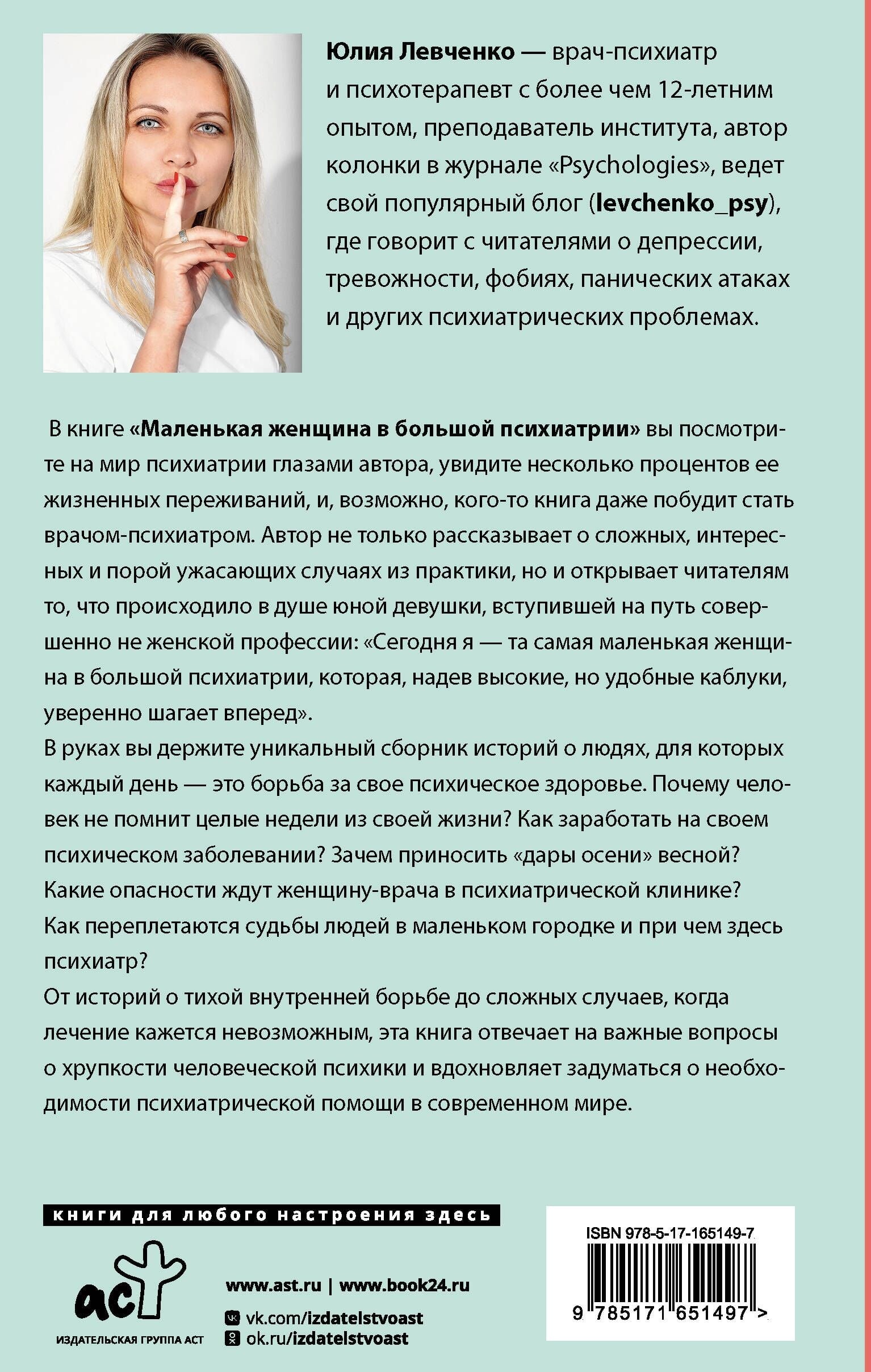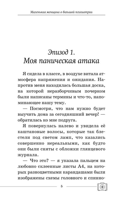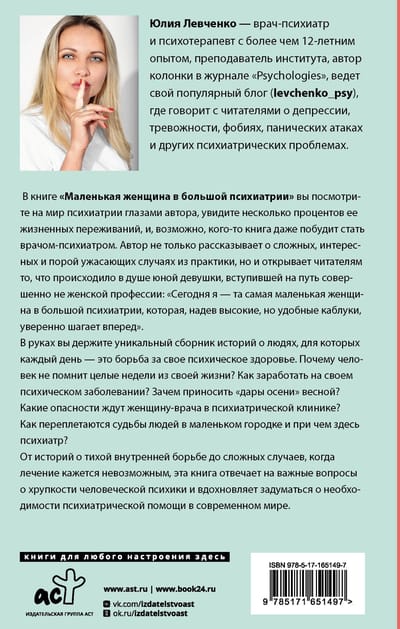 In the book "Little Woman in Big Psychiatry" you will look at the world of psychiatry through the eyes of the author, see a few percent of her life experiences, and perhaps the book will even encourage someone to become a psychiatrist. The author not only tells about complex, interesting and sometimes terrifying cases from practice, but also reveals to readers what was happening in the soul of a young girl who embarked on the path of a completely unfeminine profession: "Today I am that same little woman in big psychiatry, who, wearing high but comfortable heels, confidently walks forward."