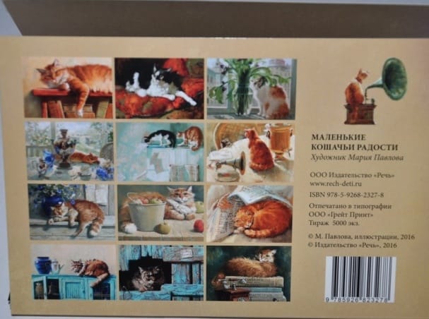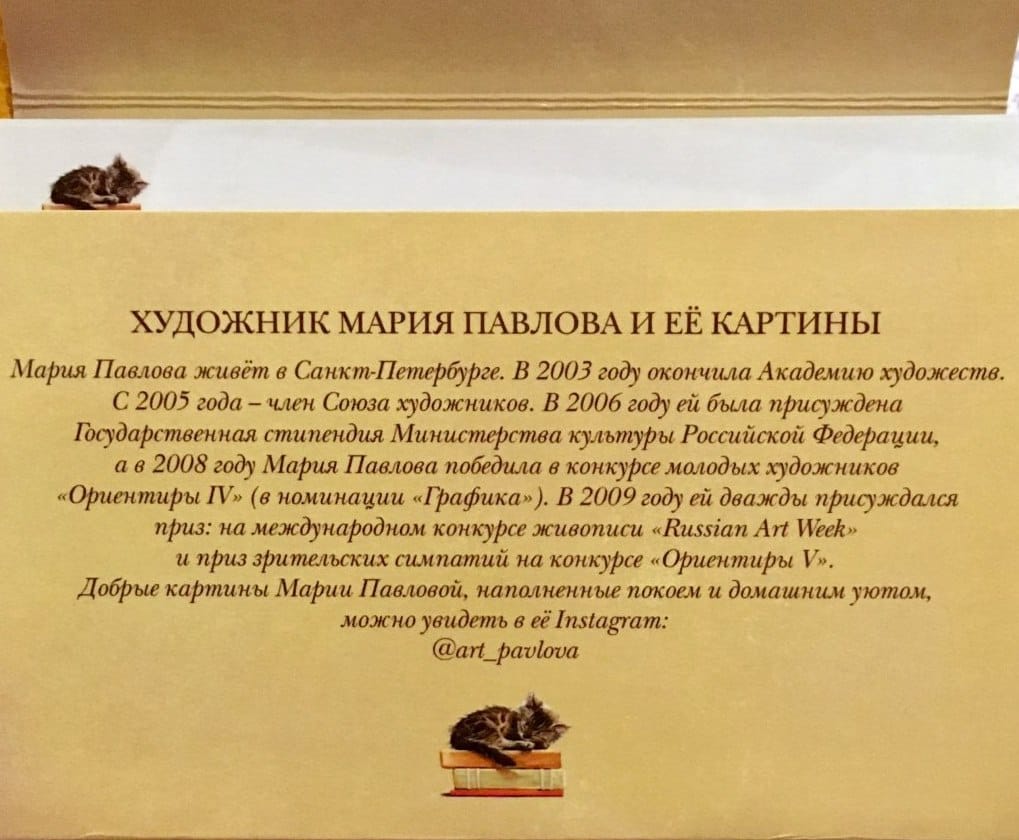 In the paintings of artist Maria Pavlova, cats look so contented and happy! You bet, because they can do anything: lie on velvet cushions, throw notes off the piano, nibble flowers, sleep on their owner's lap, jump on the sideboard and lounge on the bookshelves. This set of cards includes Maria's illustrations for the books "The Christmas Tree, the Cat and the New Year" and "The Sparrow and the Magician", as well as independent works based on her interactions with four-legged, furry and purring animals.