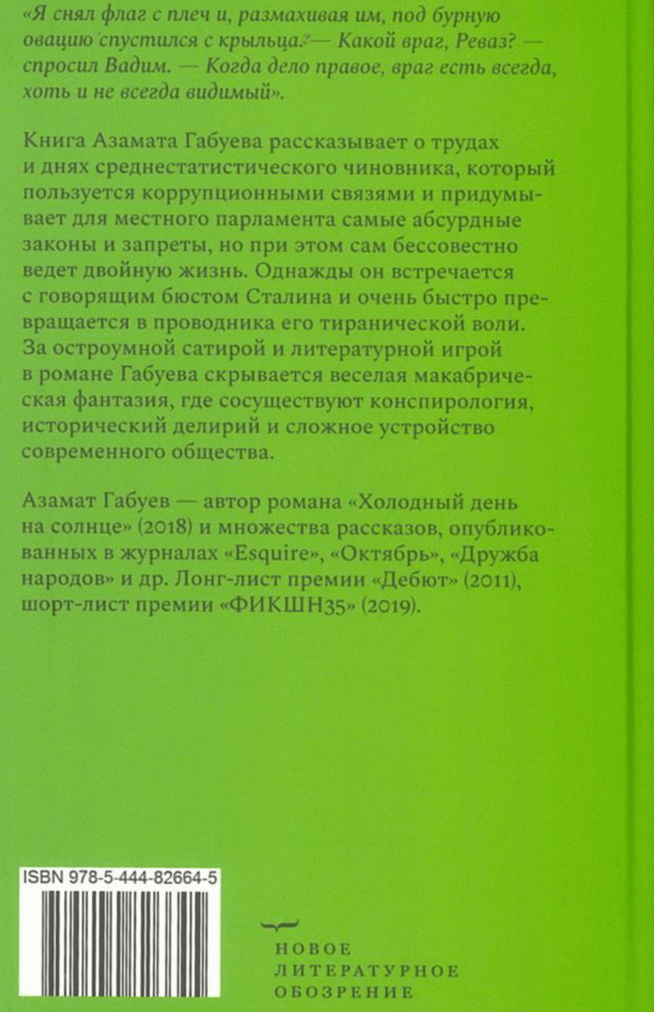 "I took the flag off my shoulders and, waving it, walked down the steps to a thunderous ovation. 'What enemy, Revaz?' asked Vadim. 'When the cause is just, there's always an enemy, even if it's not always visible.'" Azamat Gabuev's book recounts the life and work of an average official who exploits corrupt connections and devises the most absurd laws and bans for the local parliament, while shamelessly leading a double life himself. One day, he encounters a talking bust of Stalin and quickly becomes the agent of his tyrannical will. Behind the witty satire and literary playfulness of Gabuev's novel lies a joyful, macabre fantasy where conspiracy theories, historical delirium, and the complex structure of modern society coexist. Azamat Gabuev is the author of the novel A Cold Day in the Sun (2018) and numerous short stories published in Esquire, Oktyabr, Druzhba Narodov, and other magazines. He was longlisted for the Debut Prize (2011) and shortlisted for the FICTION35 Prize (2019).