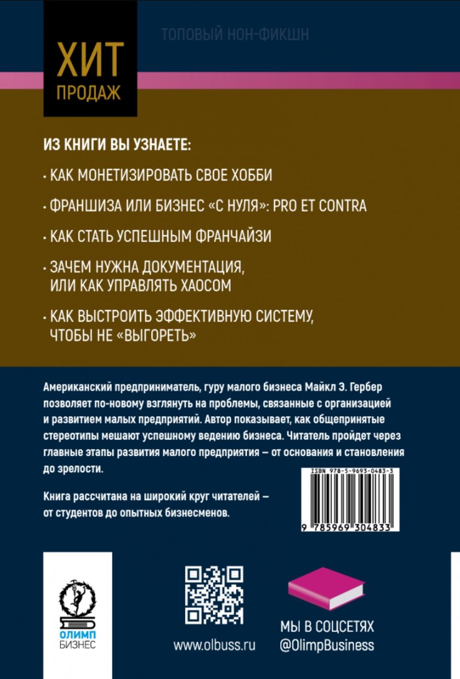 Considered a leading expert on small business, this book by Michael Gerber offers a fresh perspective on the challenges associated with starting and growing small businesses. The author demonstrates how common stereotypes can hinder successful business, guiding readers through the key stages of small business development—from founding and development to maturity. Of particular interest is the description of franchising technologies for increasing business efficiency and predictability. The book is animated by dialogues with a young female entrepreneur, who teach in an understandable manner how to properly organize, develop, and improve a business without changing one's lifestyle. The book is intended for a wide range of readers, from students to experienced businesspeople.