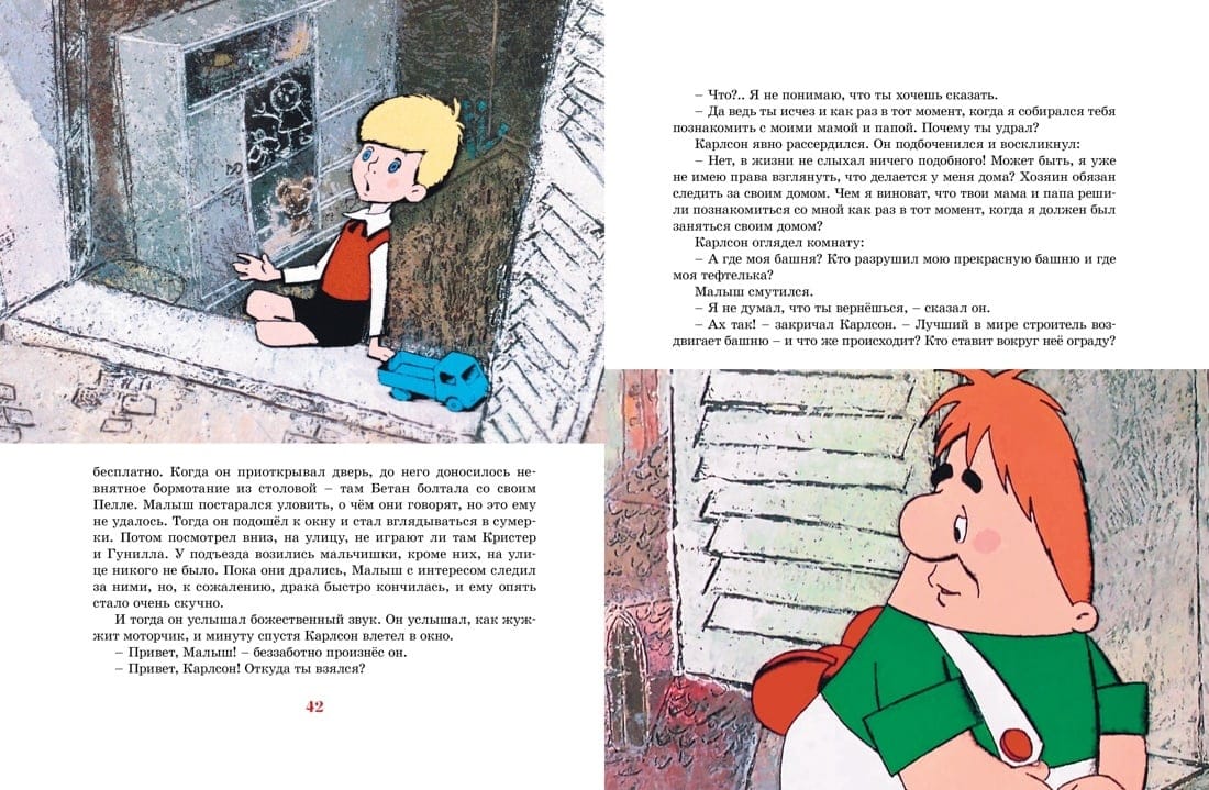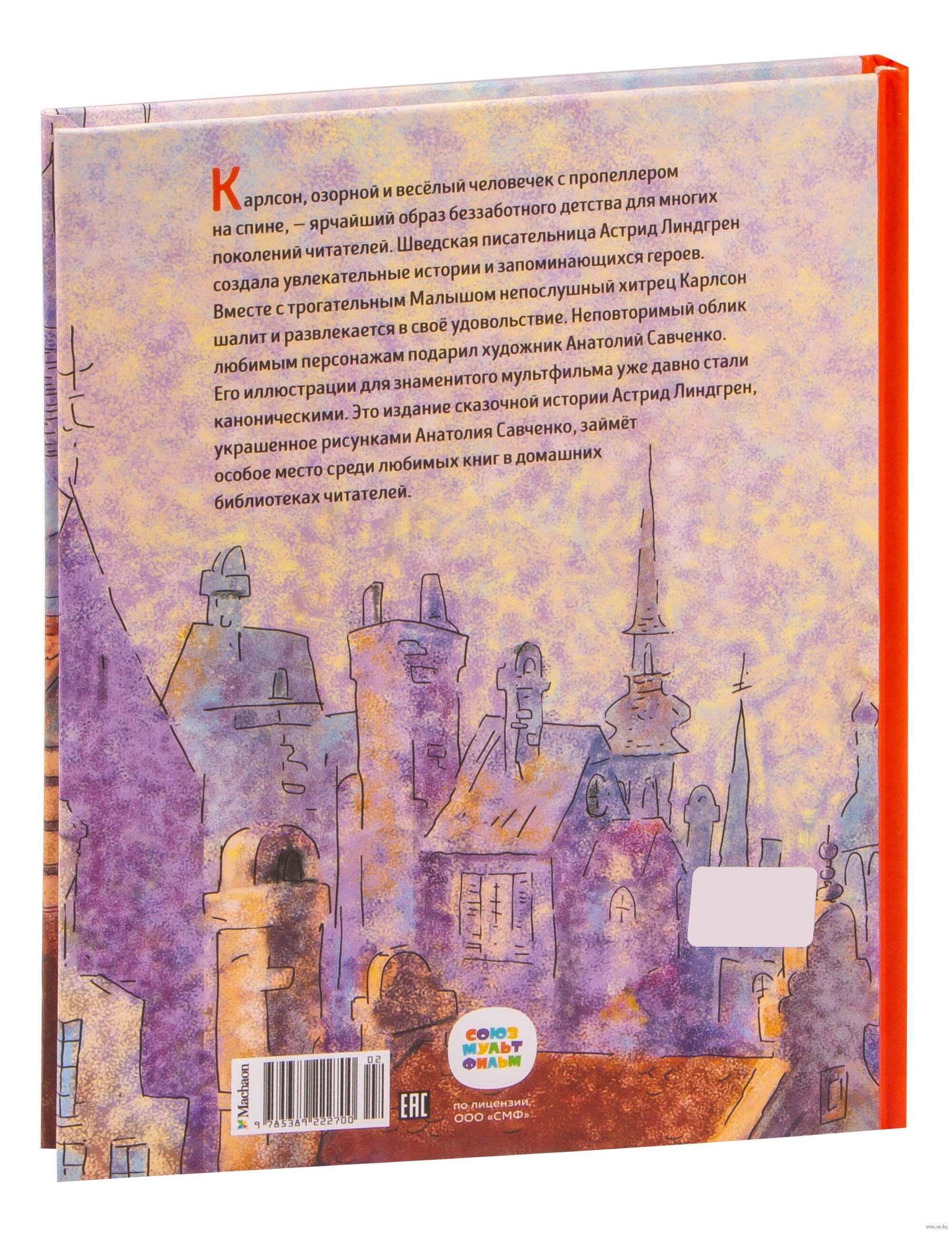 Carlson, a mischievous and cheerful little man with a propeller on his back, is the brightest image of a carefree childhood for many generations of readers. Swedish writer Astrid Lindgren created fascinating stories and memorable characters. Together with the touching Kid, the naughty sly Carlson is naughty and has fun for his own pleasure. The artist Anatoly Savchenko gave the beloved characters their unique appearance. His illustrations for the famous cartoon have long been canonical. This edition of Astrid Lindgren's fairy tale, decorated with drawings by Anatoly Savchenko, will take a special place among the favorite books in readers' home libraries.