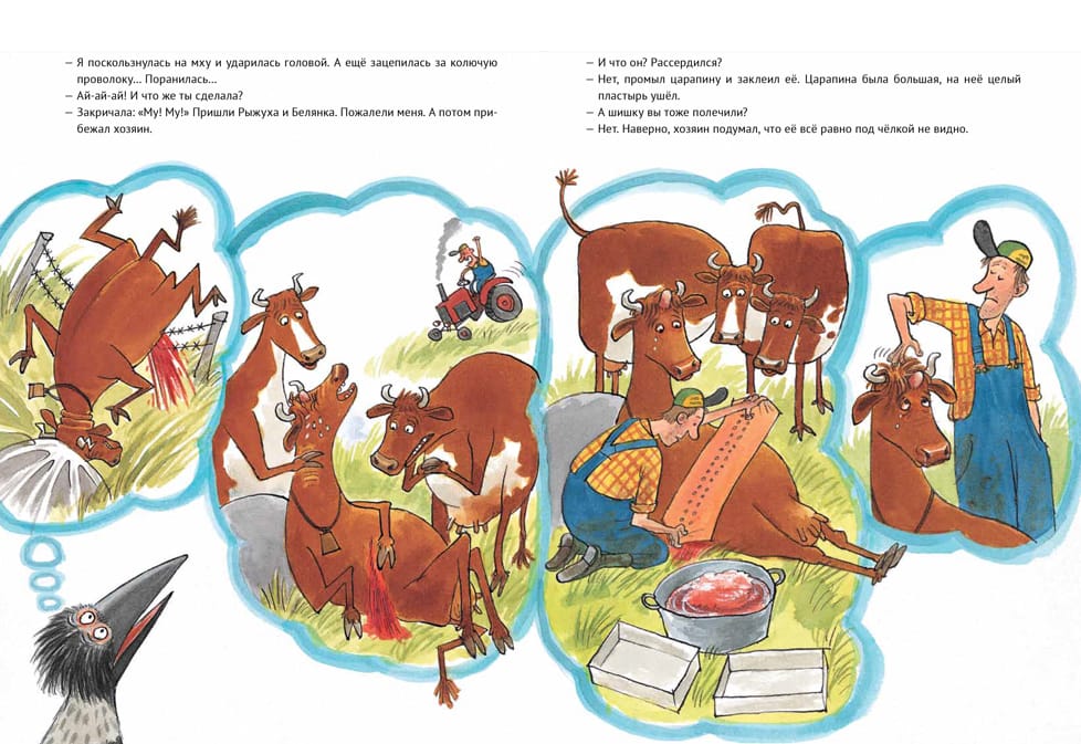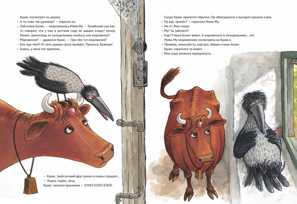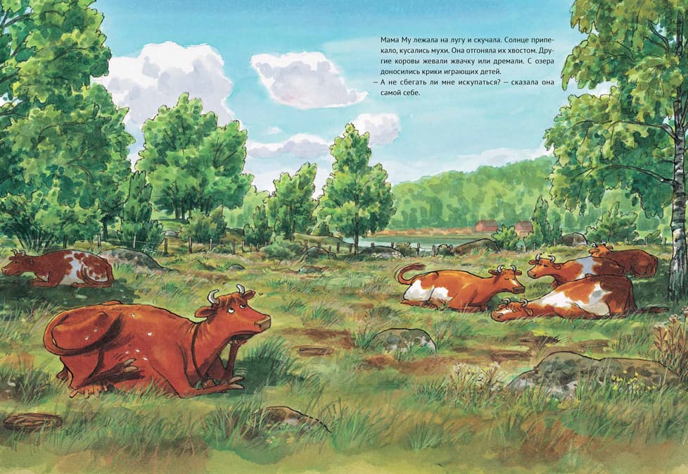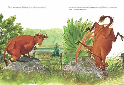 The books about Mama Moo and Krax have been translated into 30 languages and are known all over the world. The authors are Juja Wieslander, an honorary member of the Swedish Academy of Children's Books, and Sven Nordqvist, who is world-famous for his books about Petson and Findus. Mama Moo, the most restless cow in the world, can't stop grazing in the meadow when it's a nice day. She sneaks off to the lake. But on the way, Mama Moo falls! There's a bump on her head and a gash on her belly. Her faithful friend Krax comes to the rescue. He knows how to cure an adventurous cow.