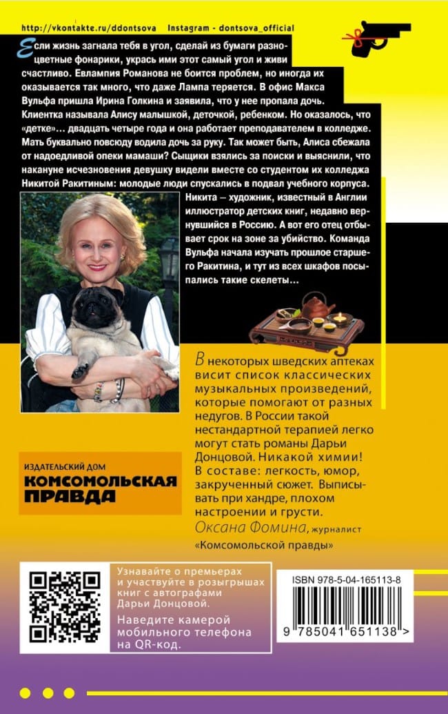 If life has cornered you, make colorful lanterns out of paper, decorate this very corner with them and live happily ever after. Evlampia Romanova is not afraid of problems, but sometimes there are so many of them that even the Lamp gets lost. Irina Golkina came to Max Wolf's office and claimed that her daughter was missing. The client called Alice a baby, a child, a child. But it turned out that the "baby" ... twenty-four years old and she works as a college professor. The mother literally took her daughter by the hand everywhere she went. So, maybe Alice escaped from the annoying guardianship of mom? Detectives took up the search and found out that the day before the disappearance of the girl was seen together with a student of their college Nikita Rakitin: young people went down to the basement of the educational building. Nikita is an artist, a well-known illustrator of children's books in England, who recently returned to Russia. His father, on the other hand, is serving time in the zone for murder. Wolfe's team began to study the senior Rakitin's past, and then such skeletons sprinkled from all the closets....