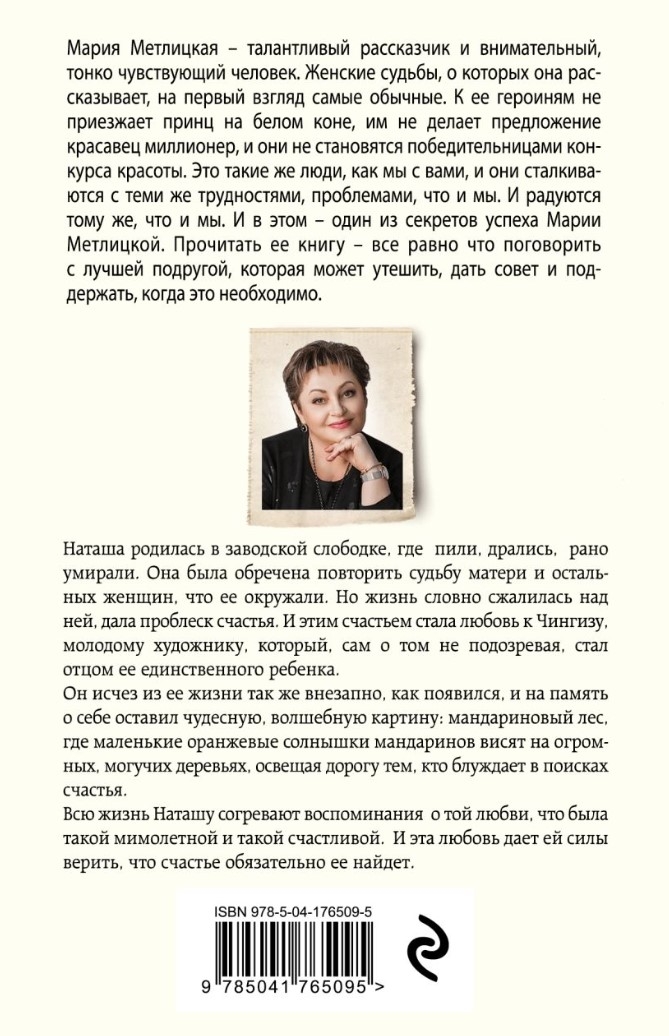Natasha was born in a factory slobodka where people drank, fought, and died early. She was doomed to repeat the fate of her mother and the other women around her. But life seemed to take pity on her, gave her a glimmer of happiness. And this happiness was the love for Chingiz, a young artist, who, without realizing it, became the father of her only child. He disappeared from her life as suddenly as he appeared, and in memory of himself left a wonderful, magical picture: a tangerine forest, where small orange suns of tangerines hang from huge, mighty trees, lighting the way for those who wander in search of happiness. All her life Natasha is warmed by the memories of that love, which was so fleeting and so happy. And this love gives her the strength to believe that happiness will surely find her.