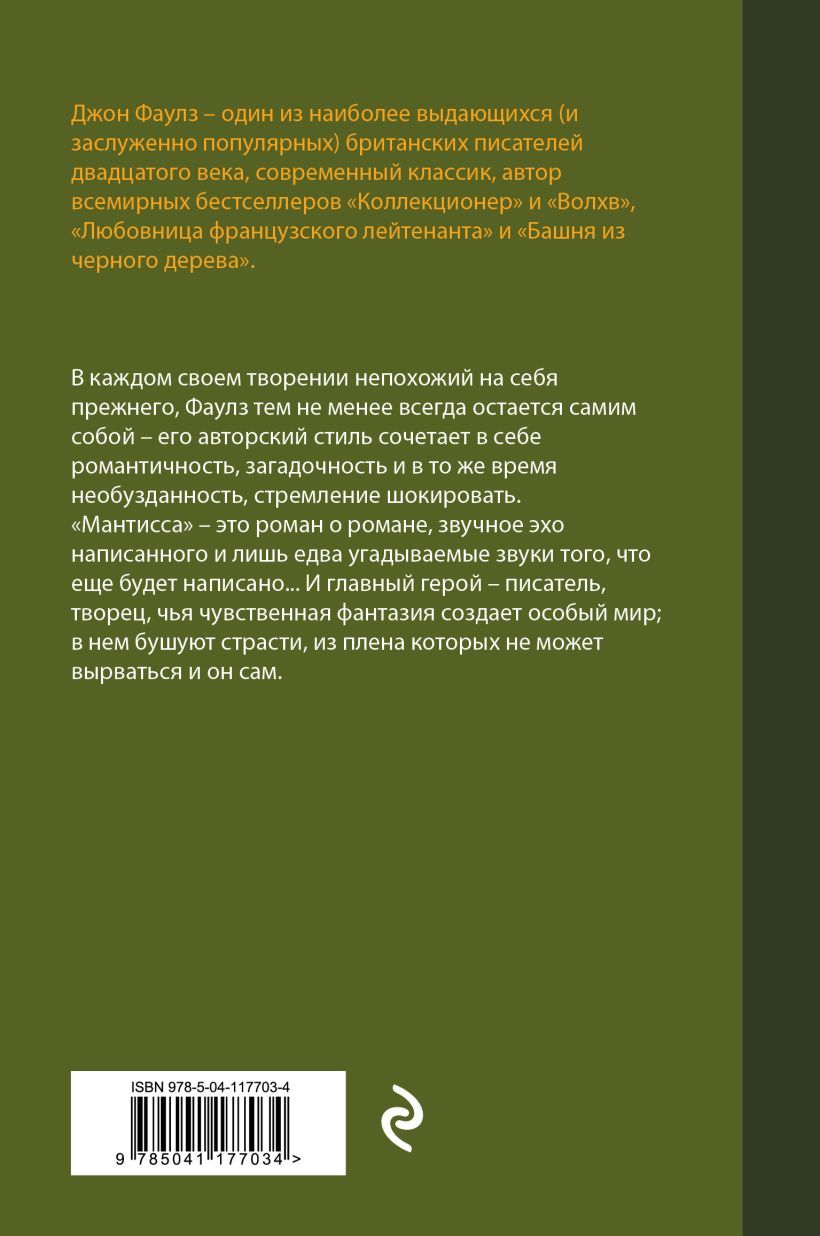 John Fowles is one of the most prominent and deservedly popular British writers of the twentieth century, a modern classic, the author of the world bestsellers "The Collector" and "The Magus", "The French Lieutenant's Lover" and "The Ebony Tower". In each of his creations is not like his former self, Fowles nevertheless always remains himself - his authorial style combines romanticism, mystery and at the same time unbridled, the desire to shock. "Mantissa" - a novel about a novel, a resounding echo of what has been written and only barely guessable sounds of what will still be written .... And the protagonist - a writer, a creator whose sensual fantasy creates a special world, it rages passions, from the captivity of which can not escape and he himself.